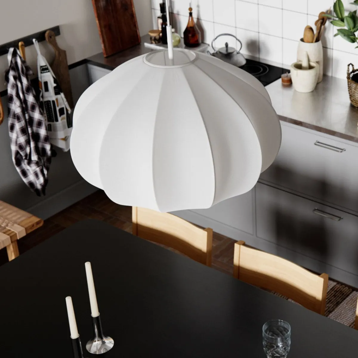 Dette er en lettplassert lampe som krever en stor E27-sokkel. Opphenget er i matt hvit metall og kompletteres av en hvit tekstilkabel, noe som bidrar til lampens elegante utseende.