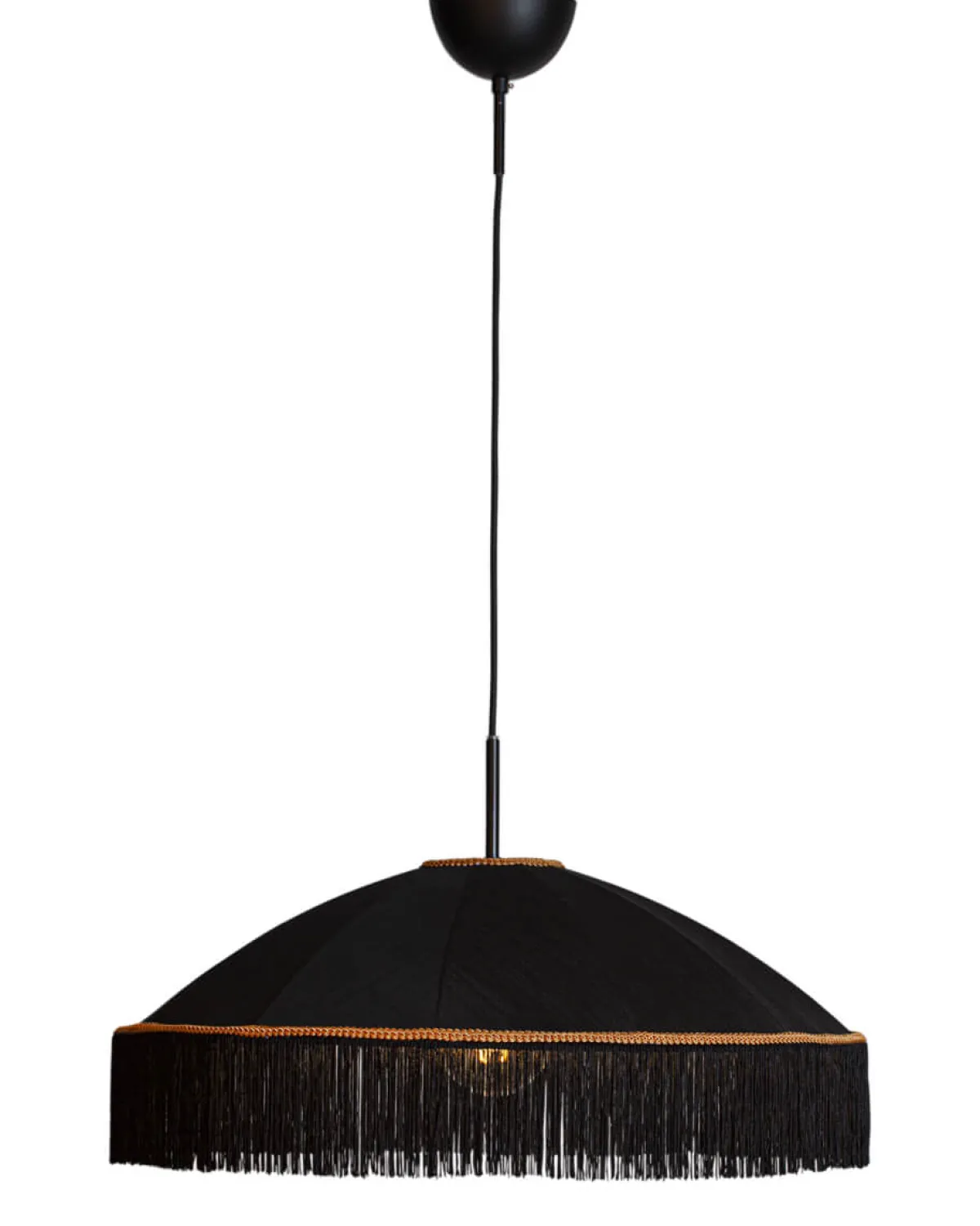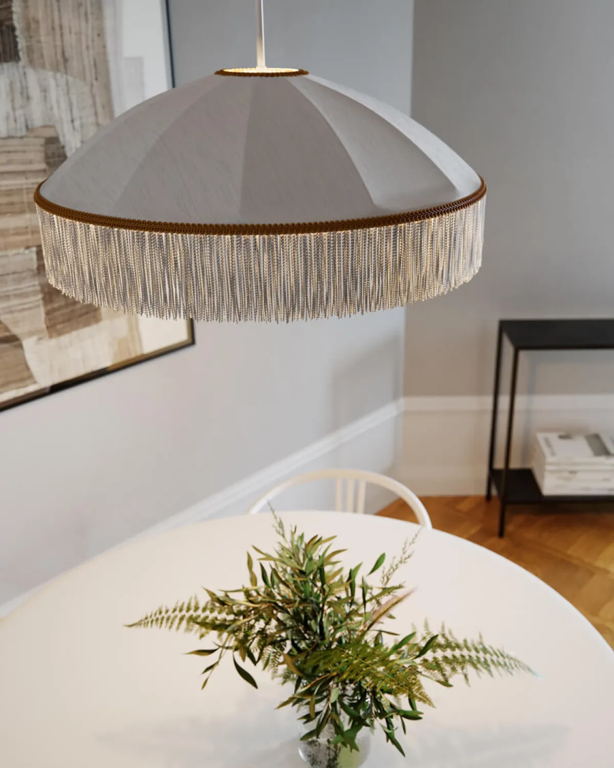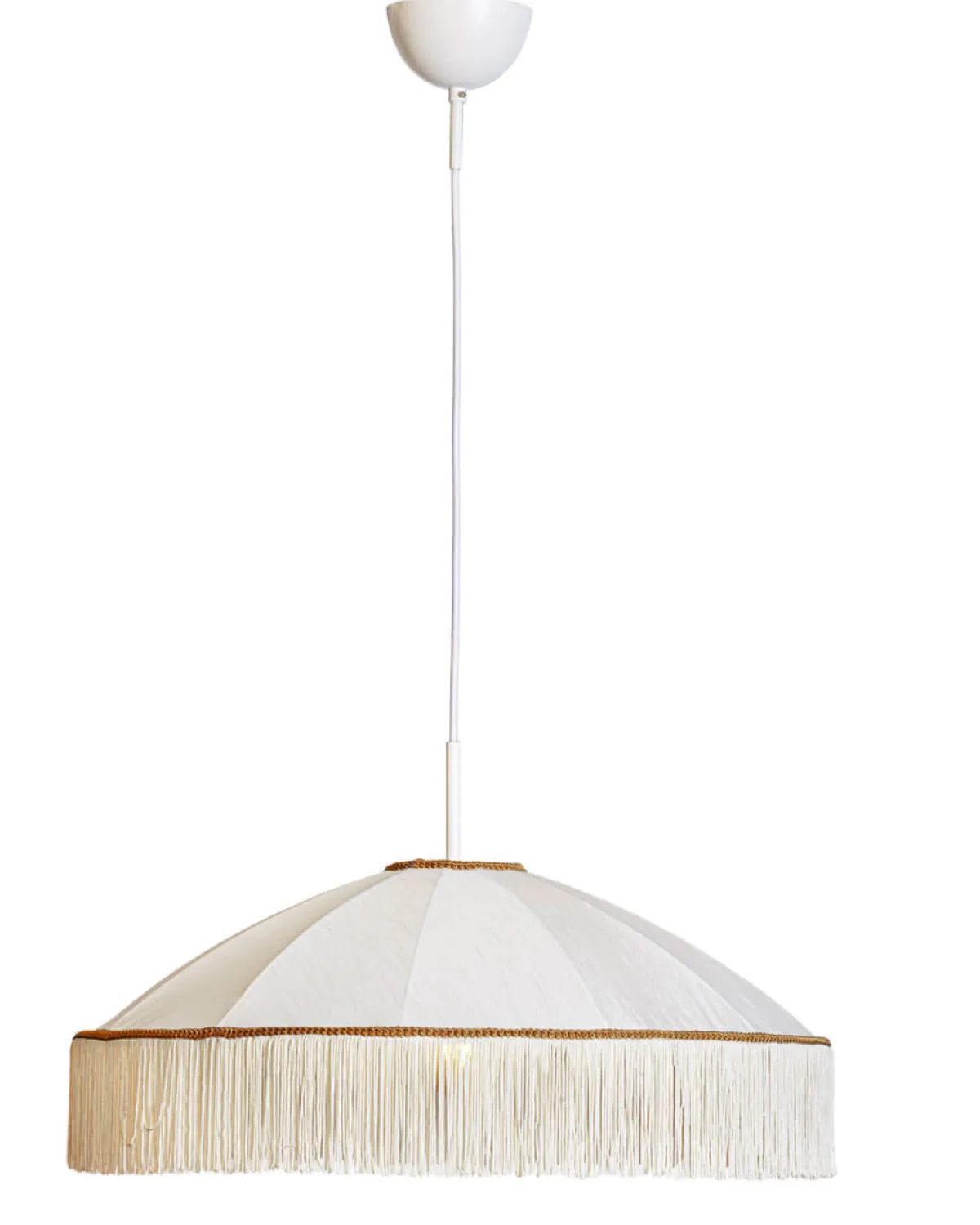 Taklampen Francis fra By Rydéns kombinerer eleganse og modernitet. Skyggen, laget av silke, er utsmykket med hengende frynser og en vakker gullkant.