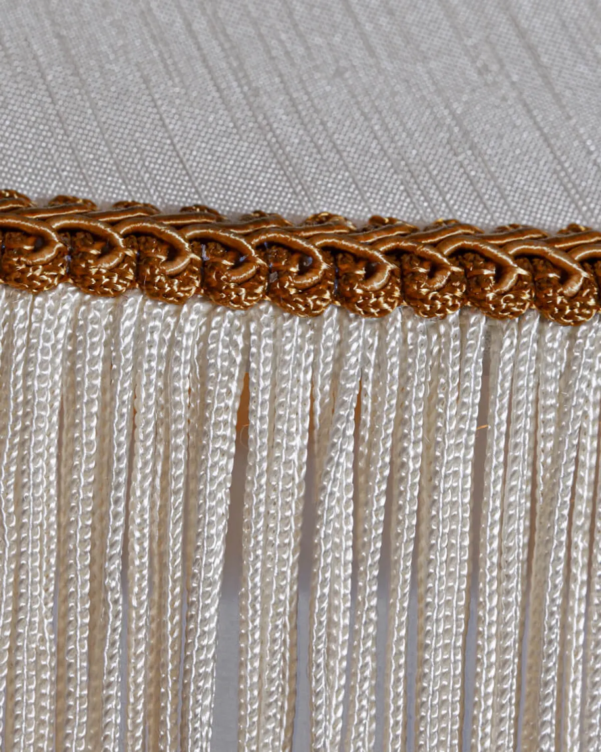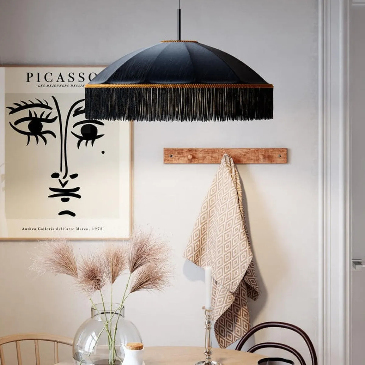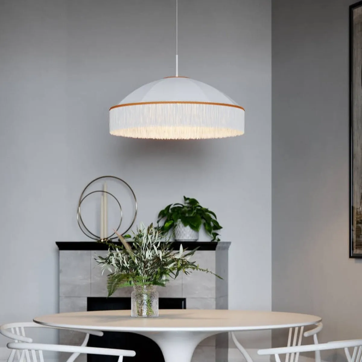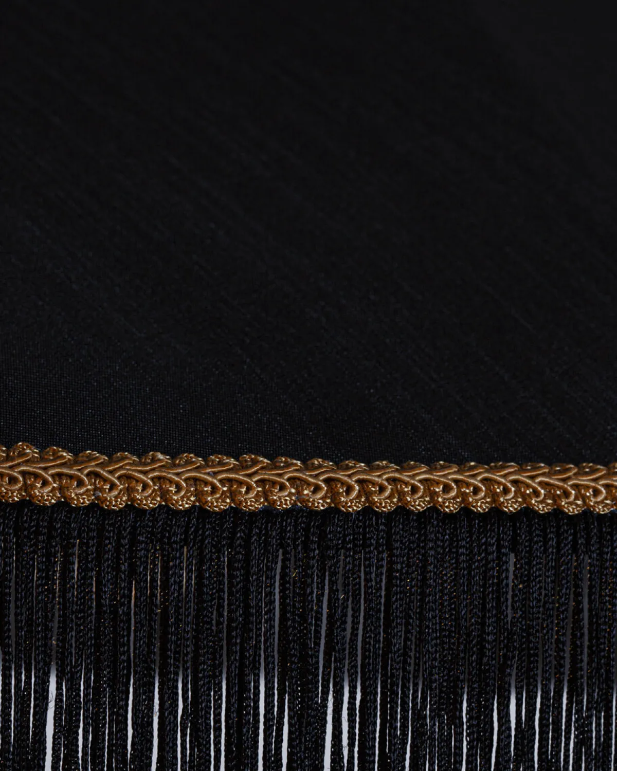 Taklampen Francis fra By Rydéns kombinerer eleganse og modernitet. Skyggen, laget av silke, er utsmykket med hengende frynser og en vakker gullkant.