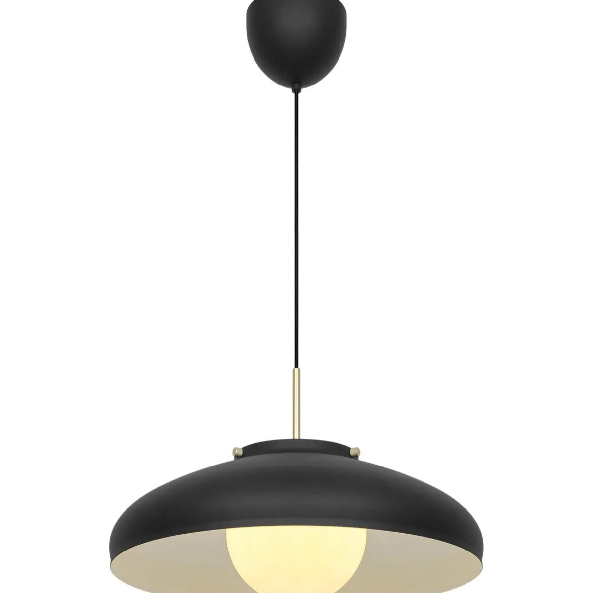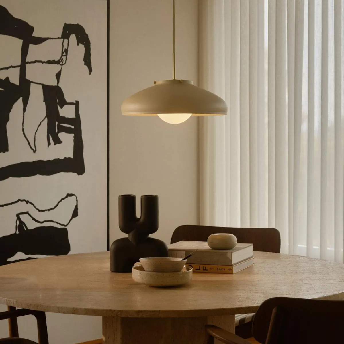 Latif er en moderne og elegant pendellampe designet av den danske designduoen Anker Studio. Skjermen er utført i ru metall med detaljer i børstet messing. Den runde diffusoren i opalglass sikrer et mykt lys som ikke blender, noe som gjør lampen perfekt over spisebordet for å skape et behagelig lys.