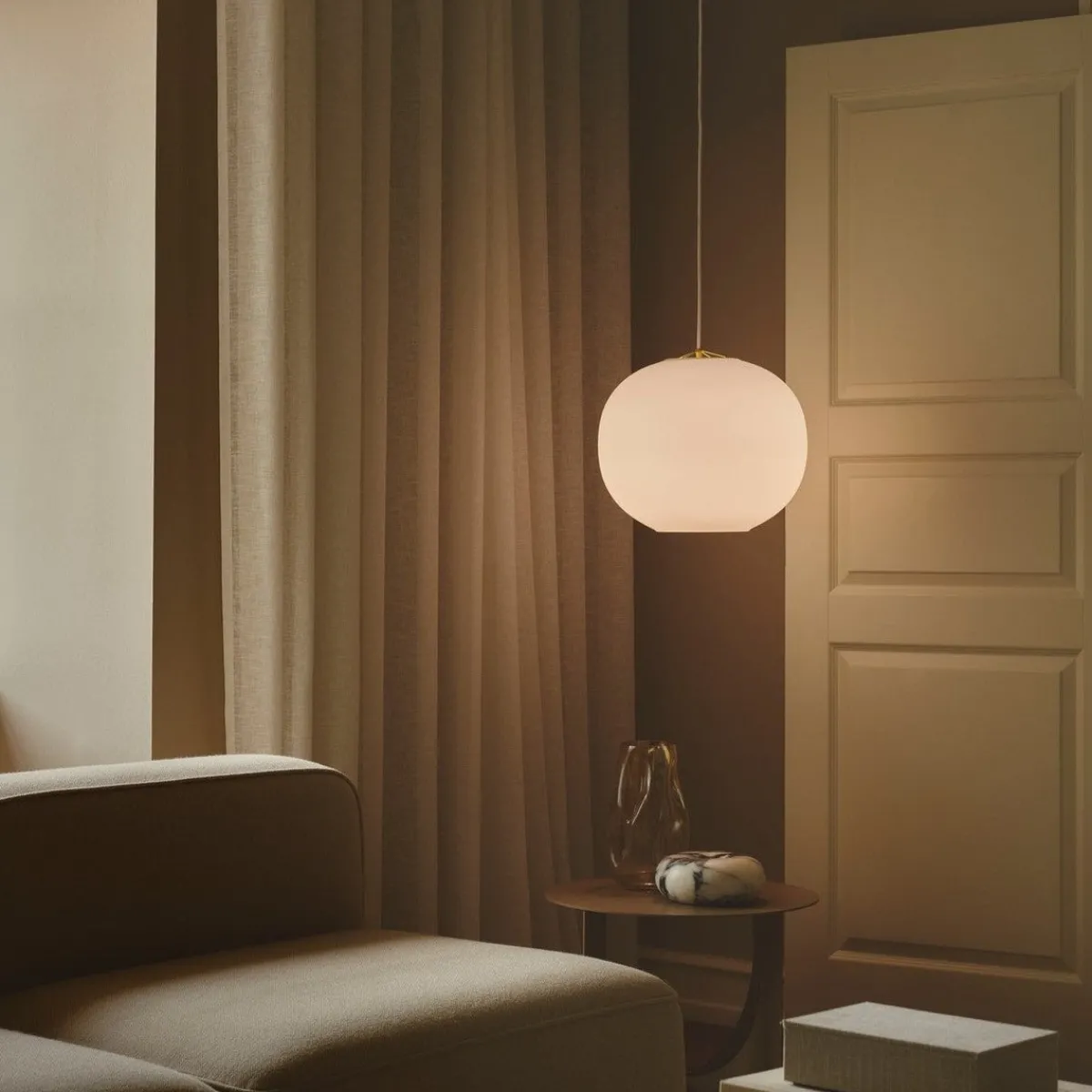 Navone er designet av det danske designstudioet Studio Mavro//Lefèvre by Sofie Lefèvre. Den generelle formen på skjermen er myk og rund, men den svært subtile buede bunnen tilfører en ny interessant dimensjon som forvandler lampen til mer enn bare en kule. Messingdetaljene tilfører et moderne preg, og understreker lampens avbrutte lyshet.