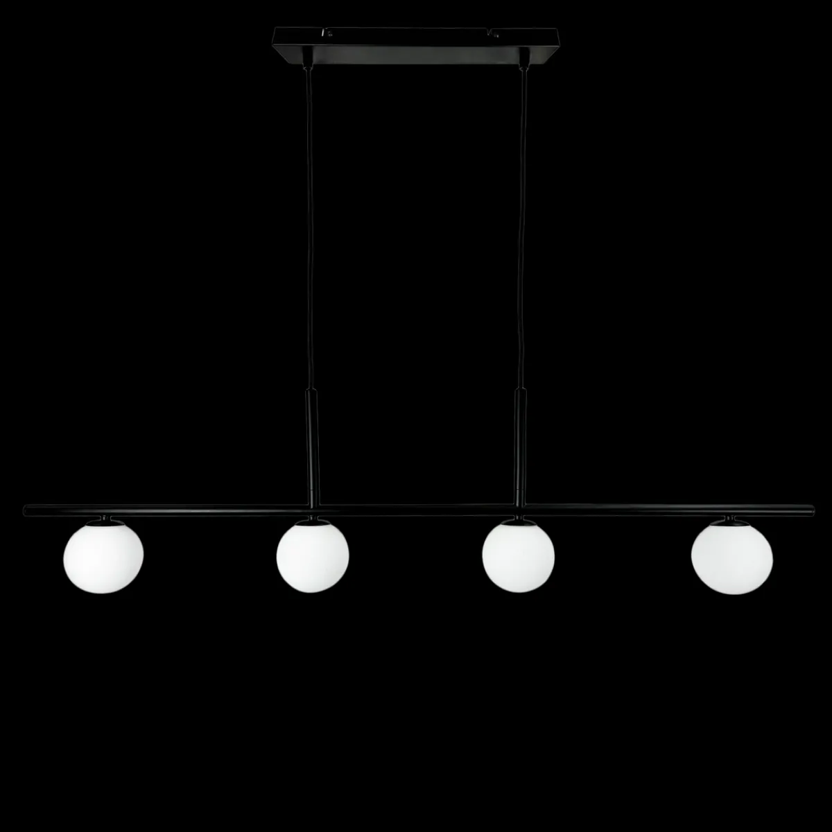 ALICE er en pendel som skal henge over og lyse opp det lange spisebordet. På grunn av størrelsen er denne pendellampen også ideell for kjøkkenøya og bordet. Den enkle, men elegante lampen er laget av metall med en matt svart finish og har 4 lyskilder, hver inne i sin egen opalglasskuppel. Metallet sørger for at lampen henger vakkert, og opalglasset gir et diffust, men sterkt lys som beveger seg i alle retninger.