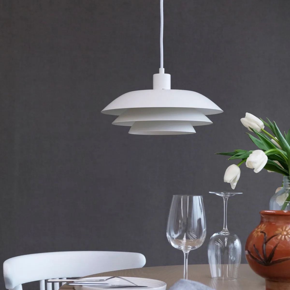DL31 anheng er veldig klassisk i fargen hvit og passer perfekt over spisebordet, kjøkkenbordet eller et lite salongbord