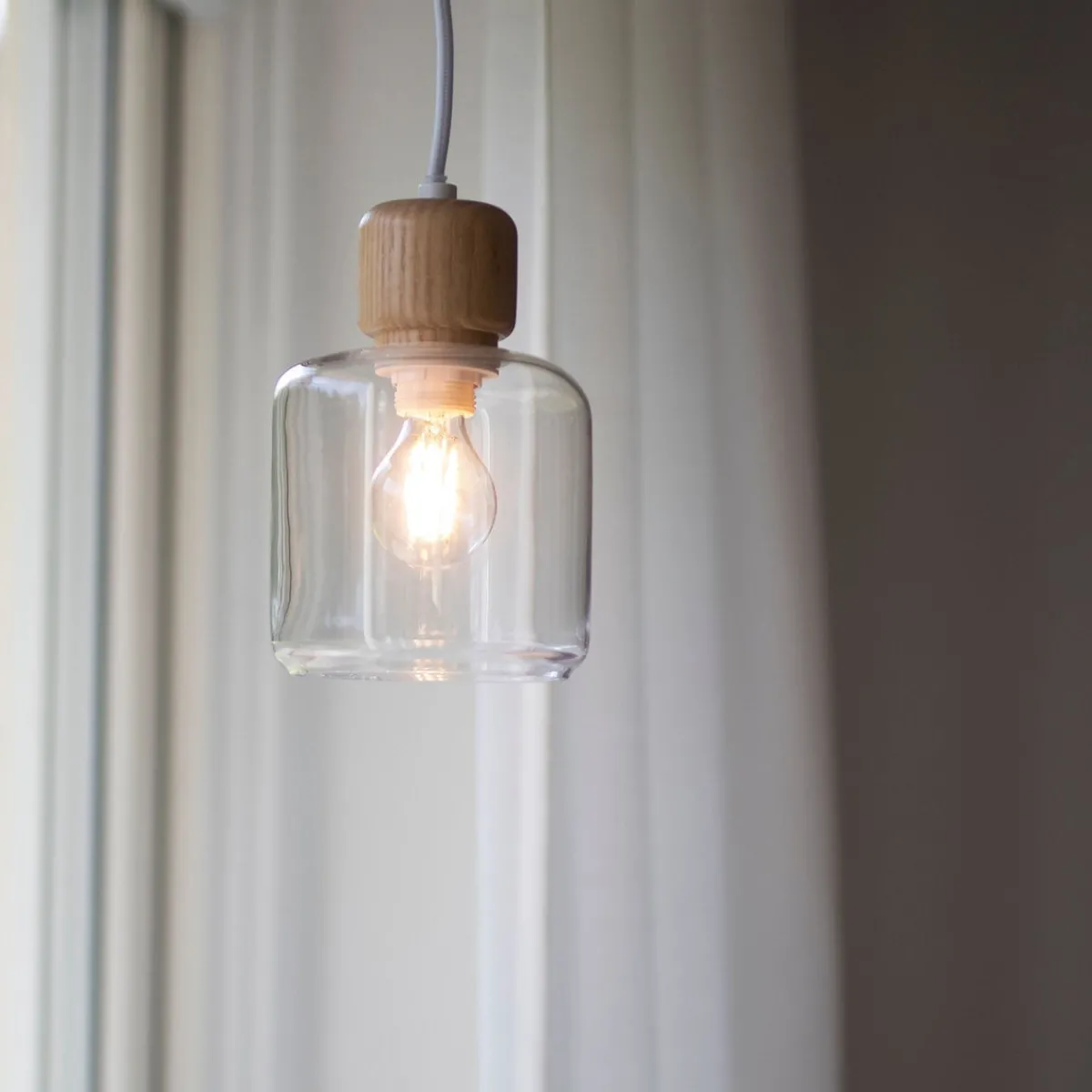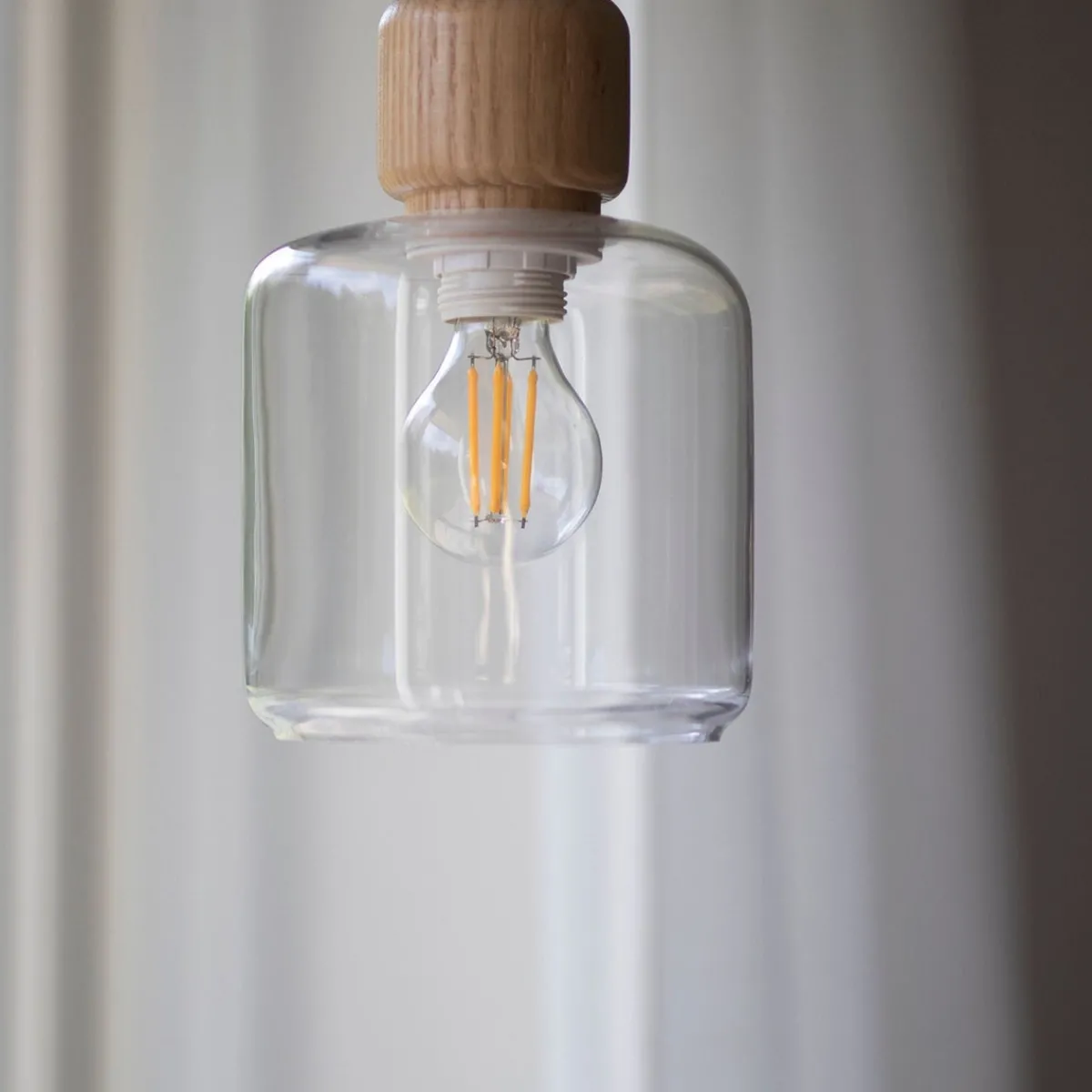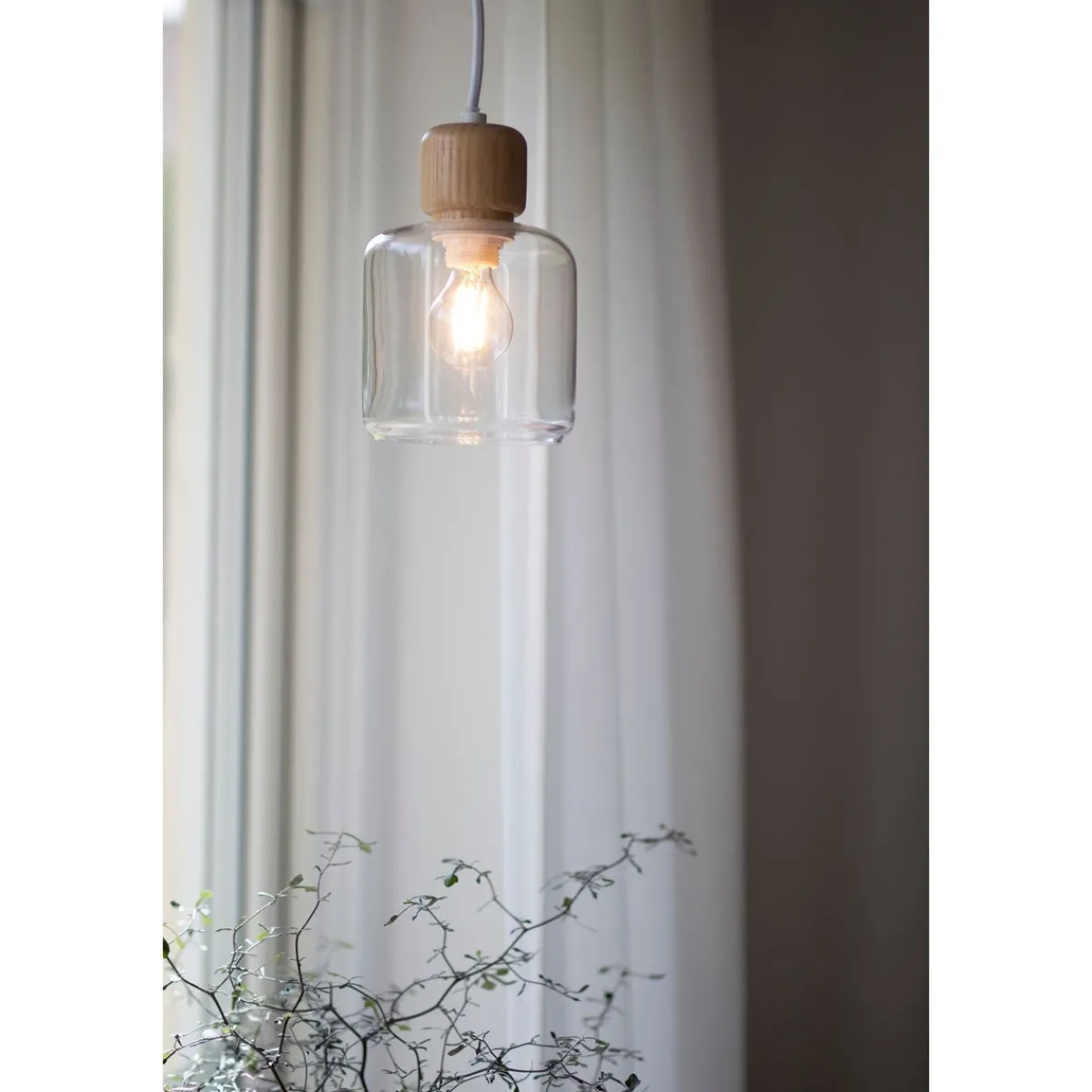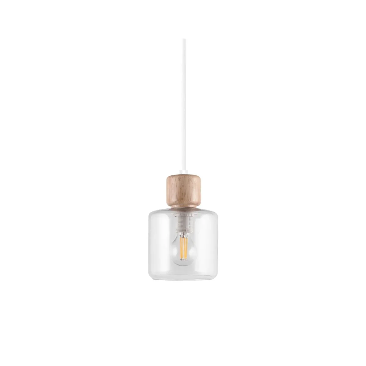 Lampen har en kopp av klart glass med knott på toppen i lyst tre. DOT har en 350 cm lang hvit tekstilledning med bryter.
