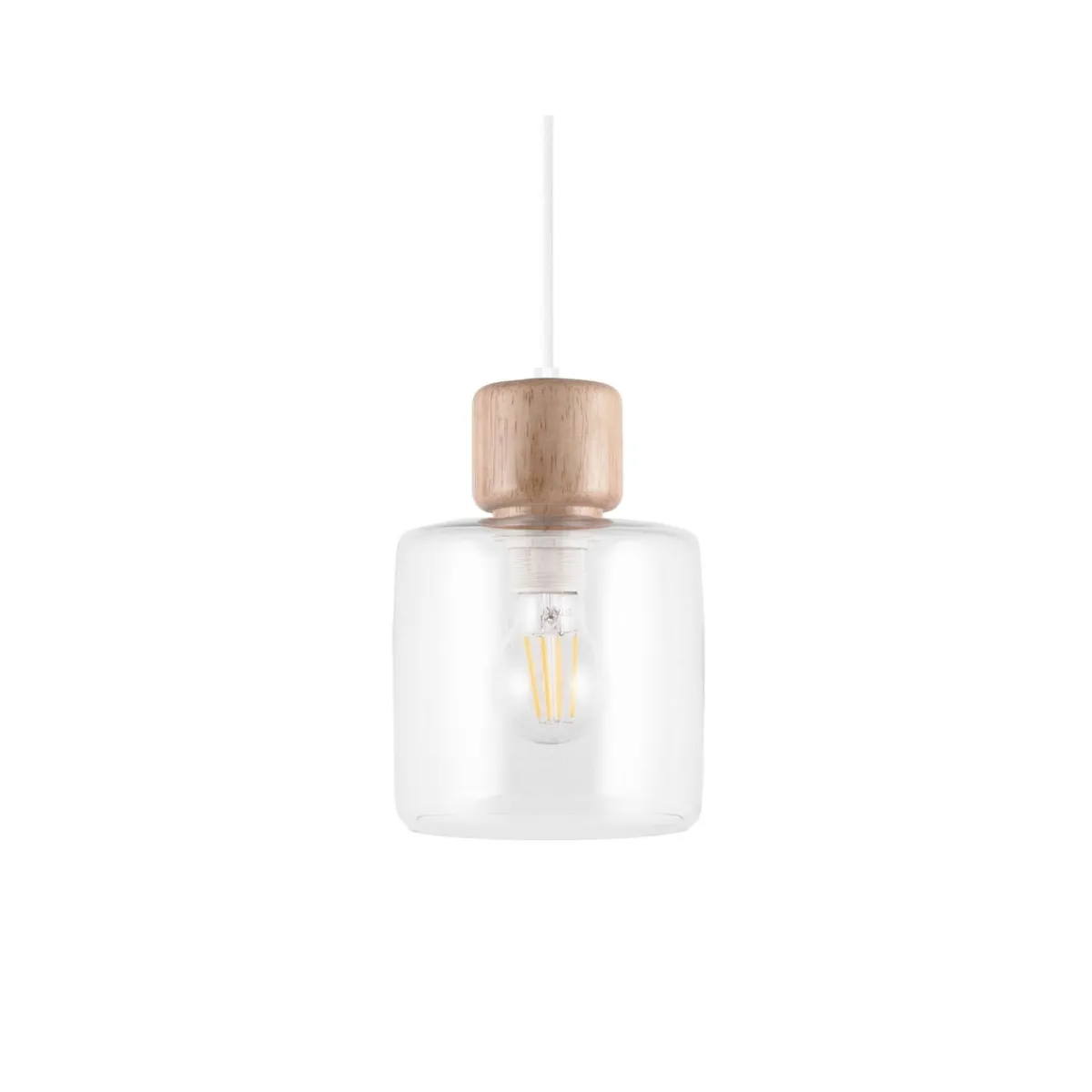 Lampen har en kopp av klart glass med knott på toppen i lyst tre. DOT har en 120 cm lang hvit tekstilkabel og takkopp i hvit plast.