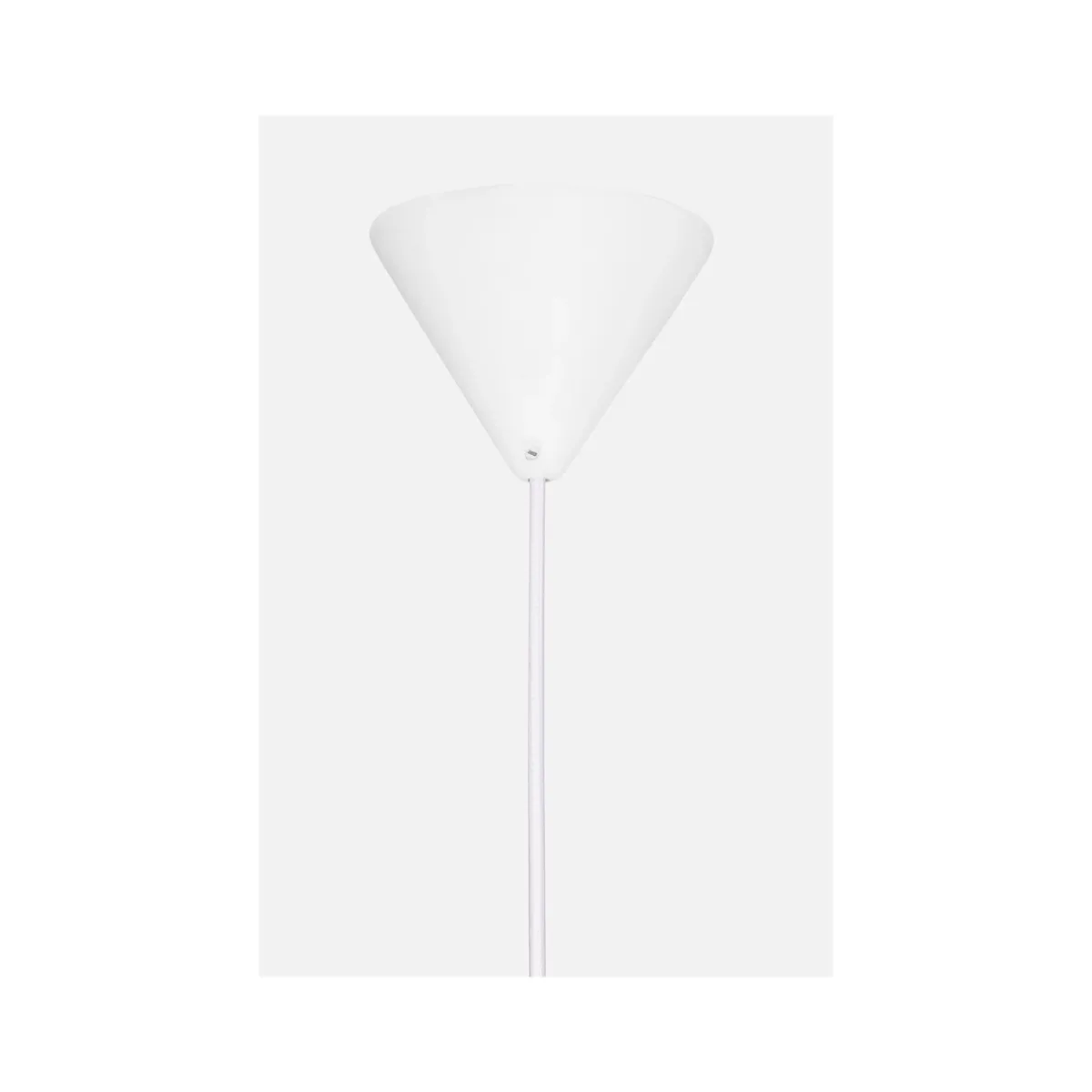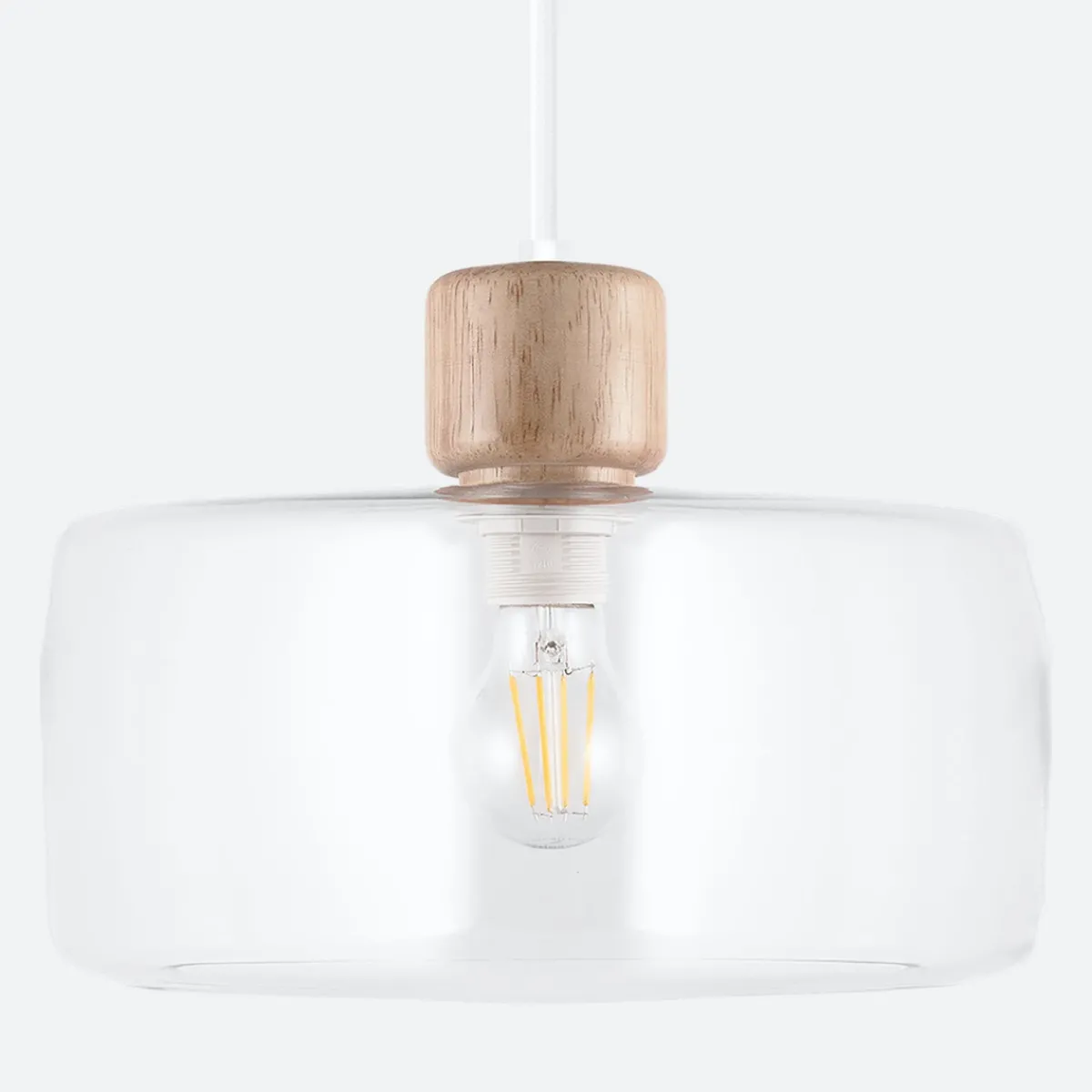Lampen har en kopp av klart glass med knott på toppen i lyst tre. DOT har en 120 cm lang hvit tekstilkabel og takkopp i hvit plast.