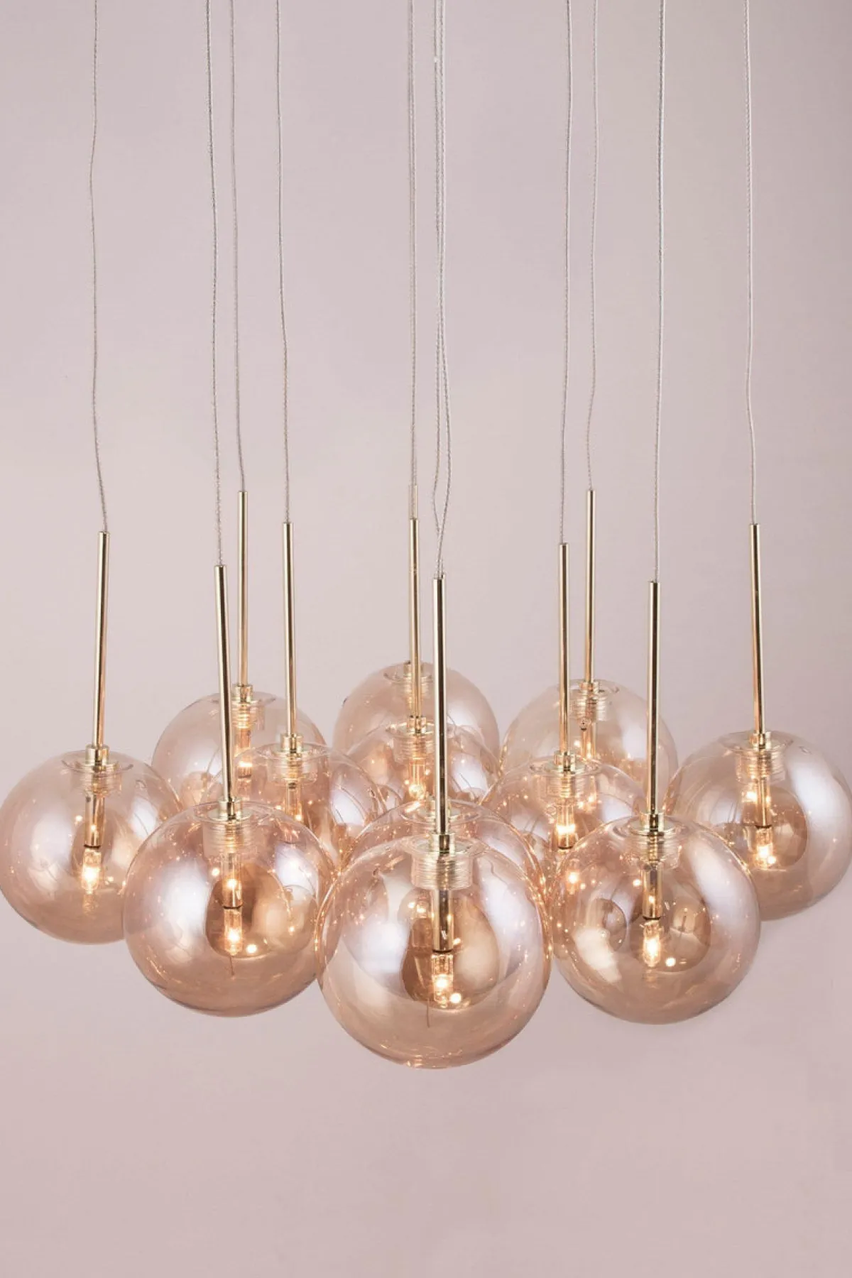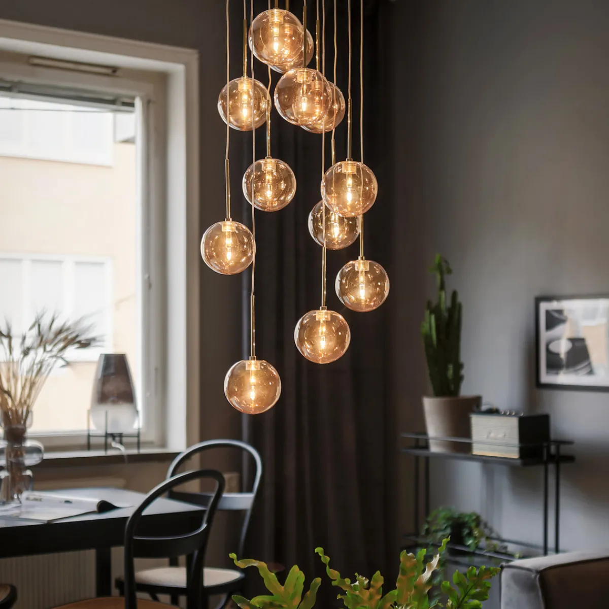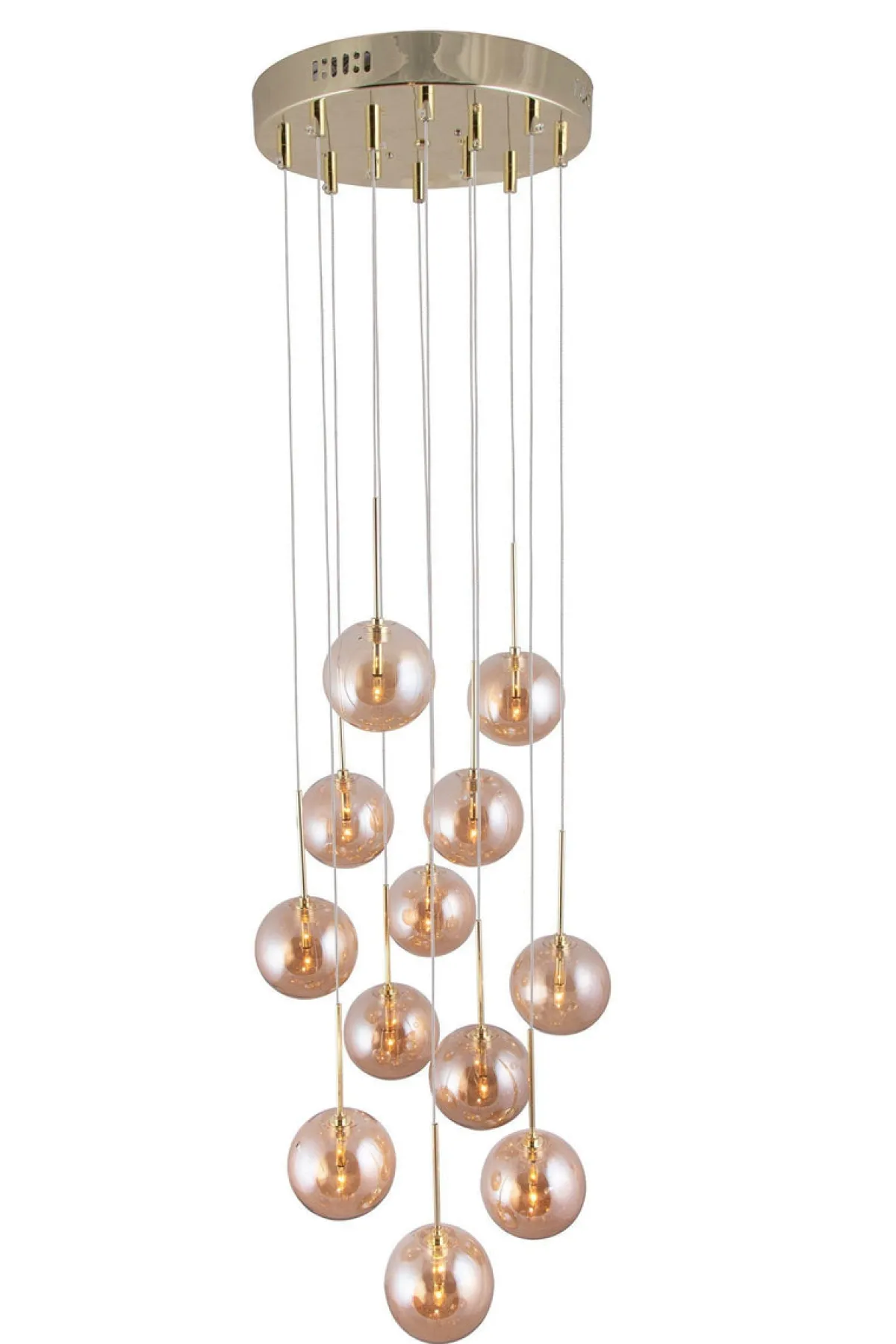 Skyfall er en nydelig takpendel med små pene glasskuler, som henger i tynne ledninger som regndråper fra himmelen. takplate i messingfarget metall er montert med en krokoppheng til taket og har 12 ledninger med amber fargede glasskuler. Hver kabel kan justeres opp og ned, med en total totalhøyde på 33 cm og en maksimal totalhøyde på 213 cm for å skape et interessant mønster med glasskuler.