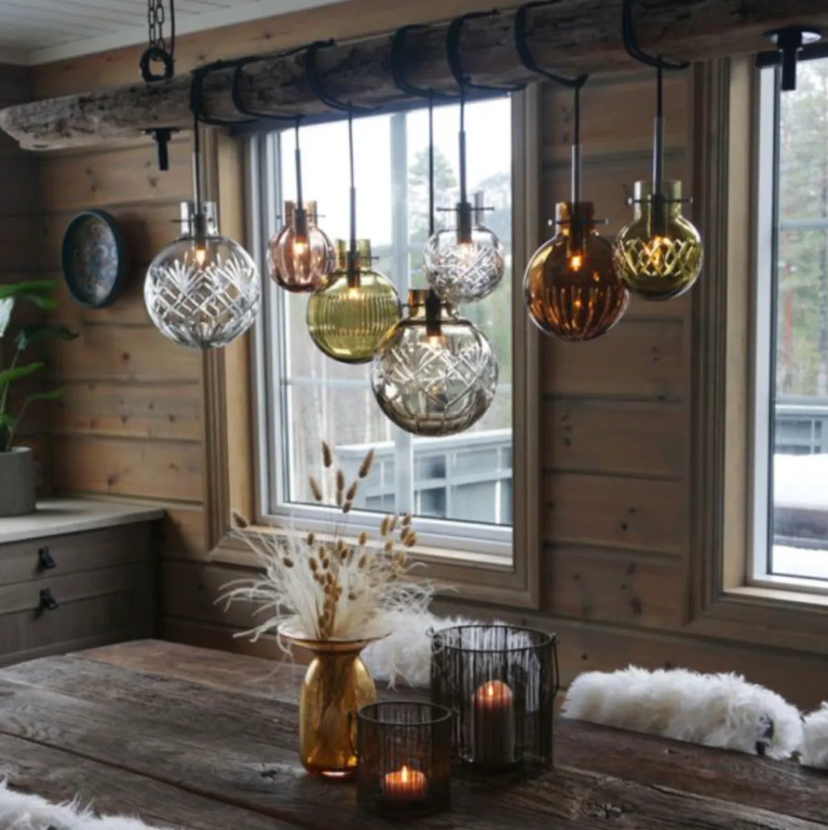Interiørstylisten Renate Larsen Lorentzen har valgt den perfekte kombinasjonen av krystallkuler til nettopp sin hytte. Hun har gått for 7 kuler i de klassiske slipmønstrene Finn, Skjær, Stor Stjerne, Kryss og Optikk i fargene klar, kakao og oliven. Nå kan du også få den lekre stilen til Renate med hennes selvkomponerte krystallkulelampe Rav.
