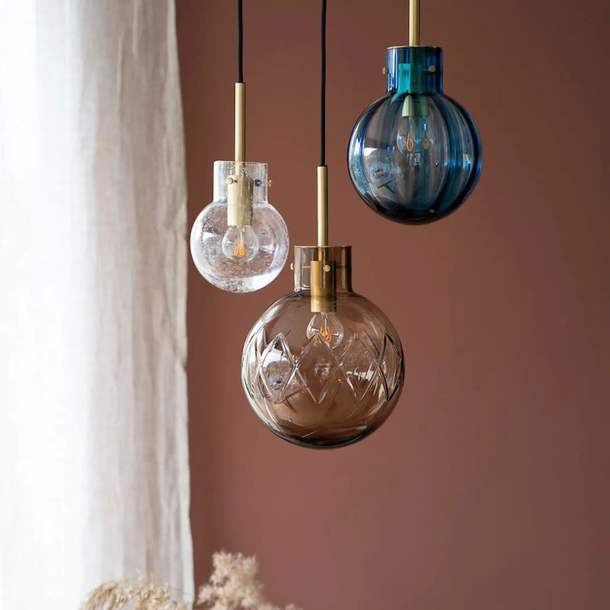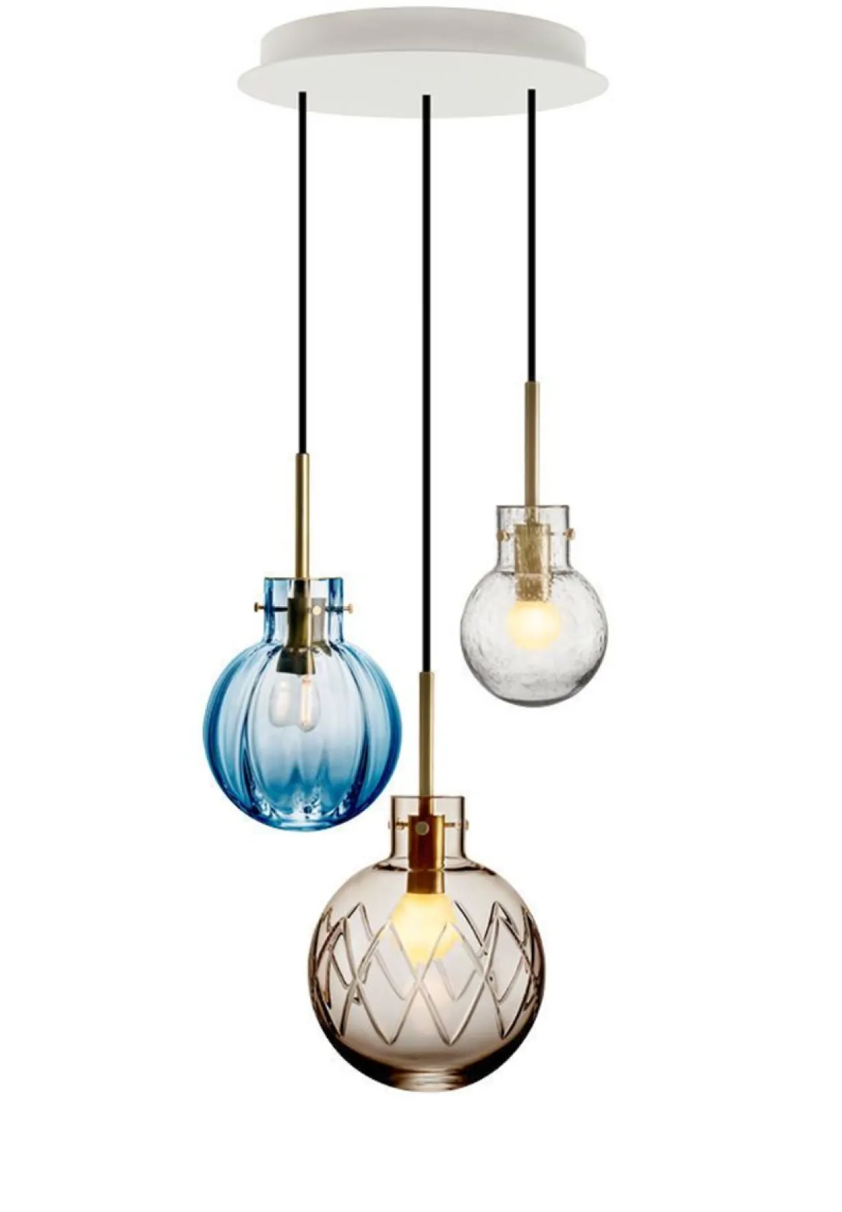 I denne kombinasjonen er det brukt følgende krystallkuler: Kryss morgenrød 200 mm, optikk klar 160 mm og soda varmgul 120 mm. Messingoppheng til 3 krystallkuler med sort tekstiltrukket kabel på 3 meter. Hvit rund takbaldakin 34cm.