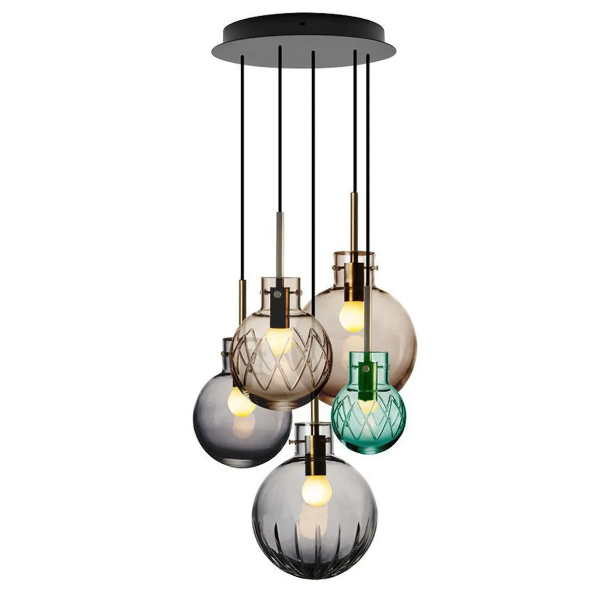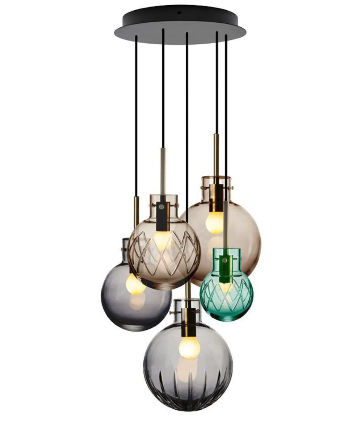 I denne kombinasjonen er det brukt følgende krystallkuler: Krystallkulene Glatt Kakao 200 mm, Stor Stjerne Røykgrå 200 mm, Glatt Røykgrå 160 mm, Kryss Kakao 160 mm og Kryss Blågrønn 120 mm