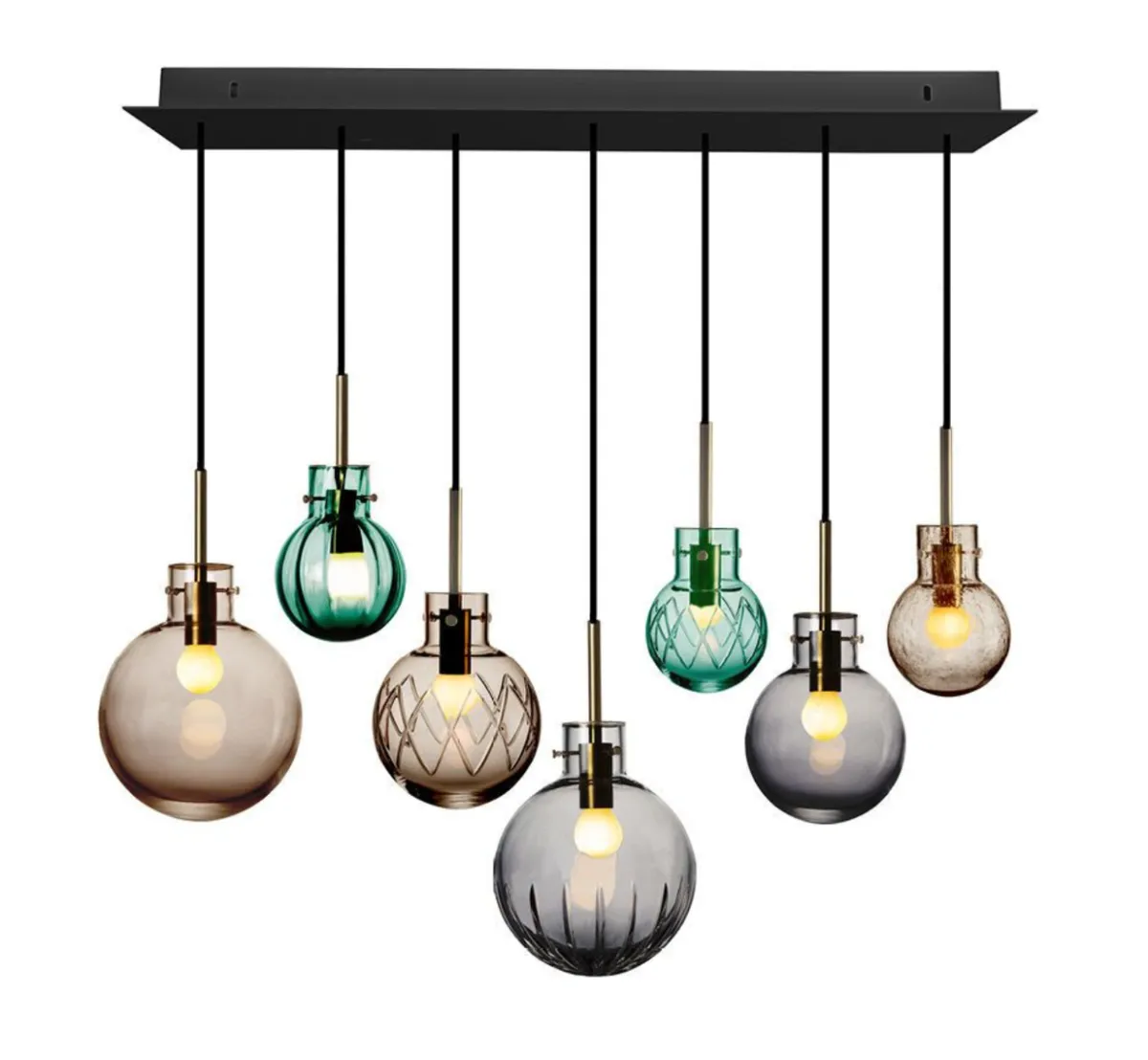 I denne kombinasjonen er det brukt følgende krystallkuler: Krystallkulene Glatt Kakao 200 mm, Stor Stjerne Røykgrå 200 mm, Glatt Røykgrå 160 mm, Kryss Kakao 160 mm, Kryss Blågrønn 120 mm, Optikk Blågrønn 120mm og Soda Kakao 120mm. Messingoppheng til 7 krystallkuler med sort tekstiltrukket kabel på 3 meter. Sort avlang takbaldakin 1 m