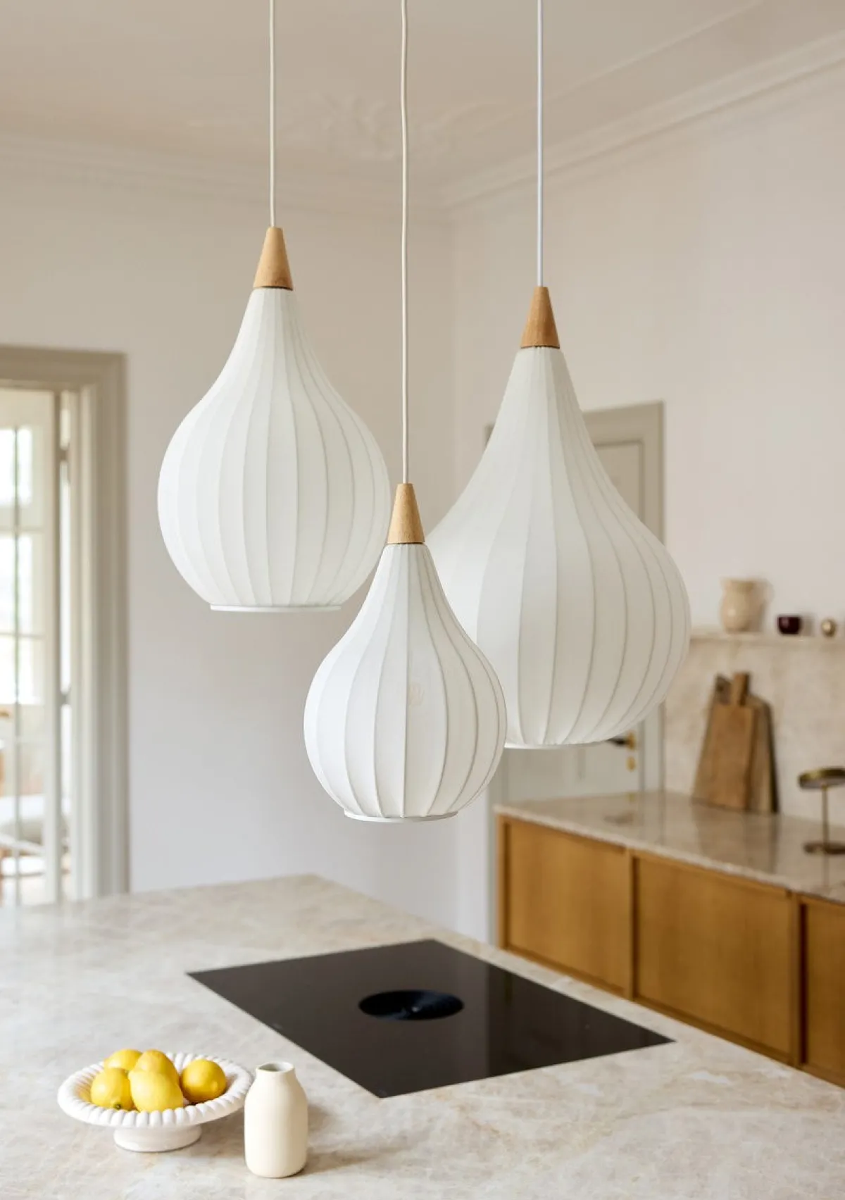 Drops pendler er designet i en kombinasjon av tekstil og tre. Lampen vil gi et behagelig lys til rommet. Den henger fint alene eller i gruppe av flere.