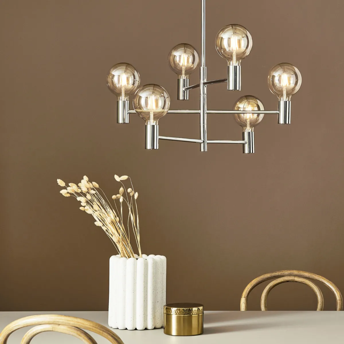 Capital-pendel fra Marksløjd, Justerbar i høyden og med vridbare armer. Minste totalhøyde er 77 cm og maks. høyde 169 cm.