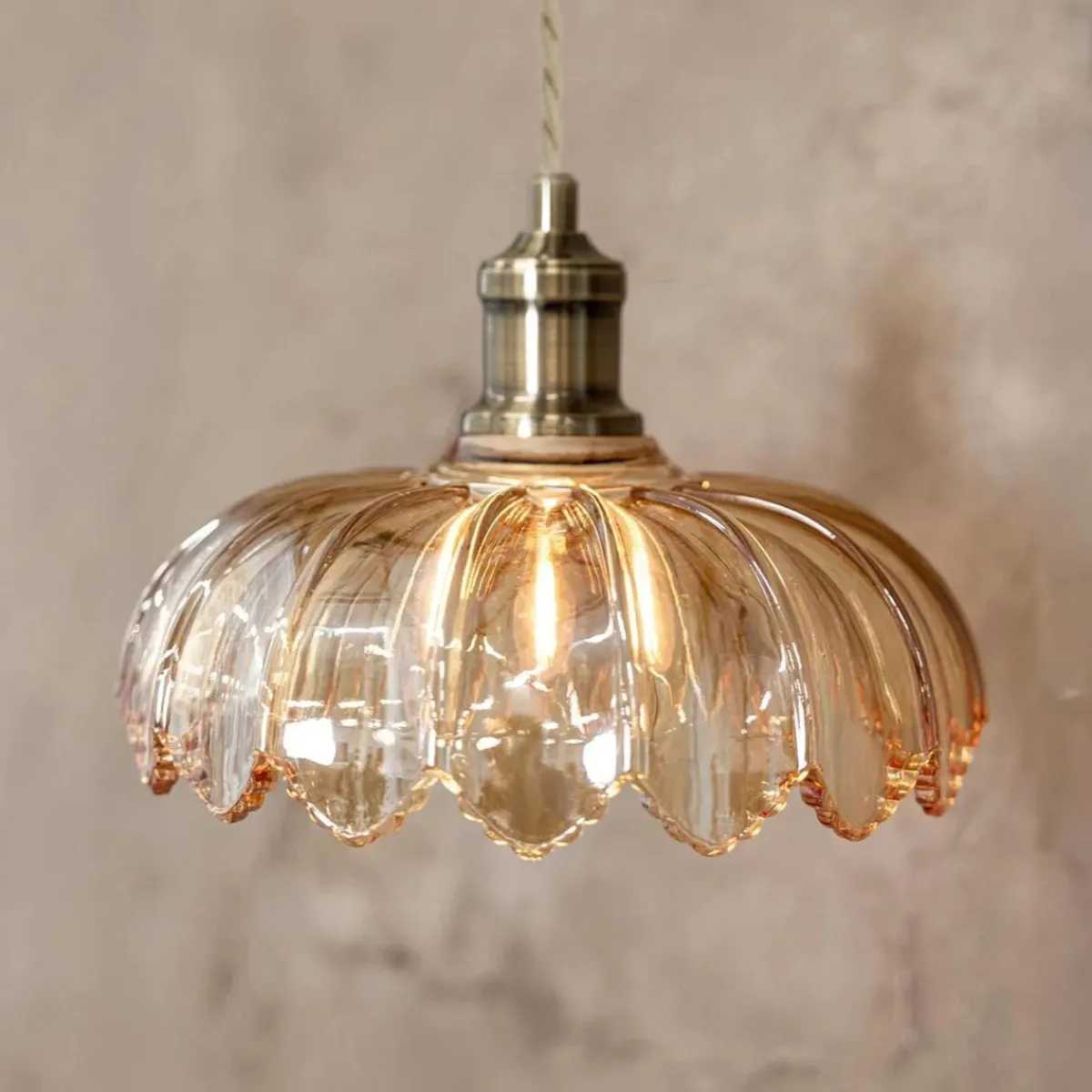 Taklampen i transparent amber farget glass med myke, bølgende former. Lampen har et lampefeste i messing og en dekorativ beige tvunnet tekstilledning som går til et rundt metallfeste i messing som monteres i taket.