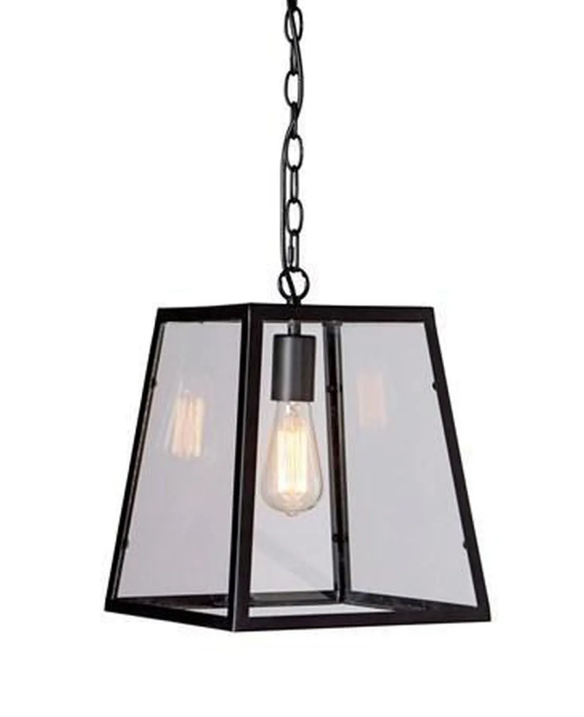 En trendy serie med sitt enkle design. Lampen har en ramme av metall med sort fargeutførelse og har skjermer av glass. Kjettingoppheng.