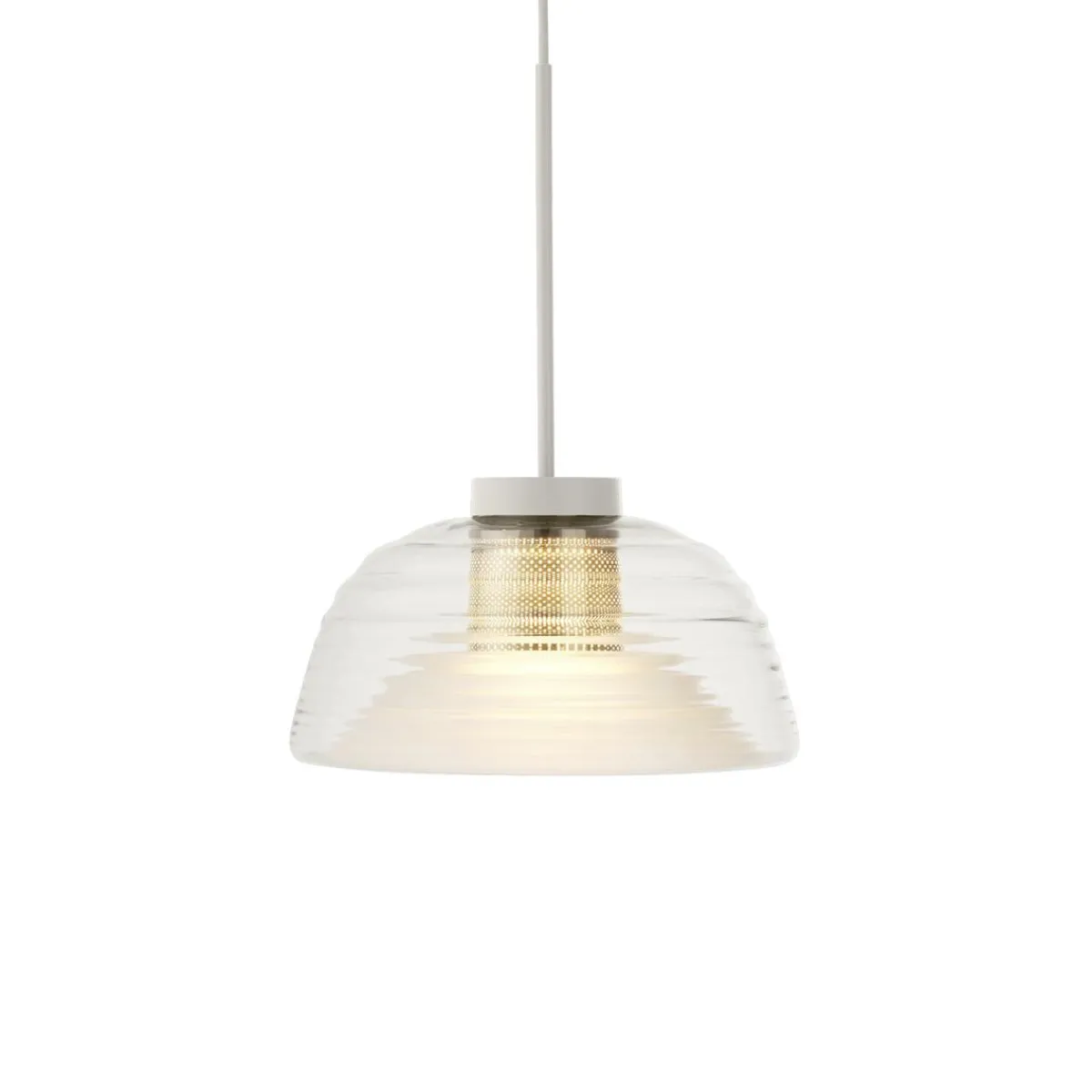 Den to-lags pendellampen gir nye perspektiver til den klassiske glasspendelen med sitt riflede, munnblåste glass, som skaper unike optiske effekter fra forskjellige vinkler. Dette raffinerte designet kombinerer klart og frostet glass med et perforert stålnett, som gir rikelig med blendingsfritt lys.