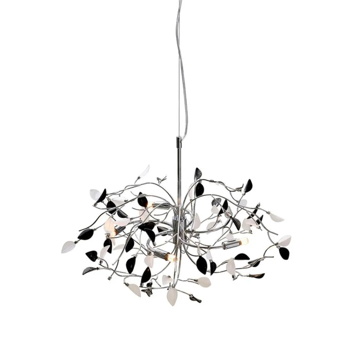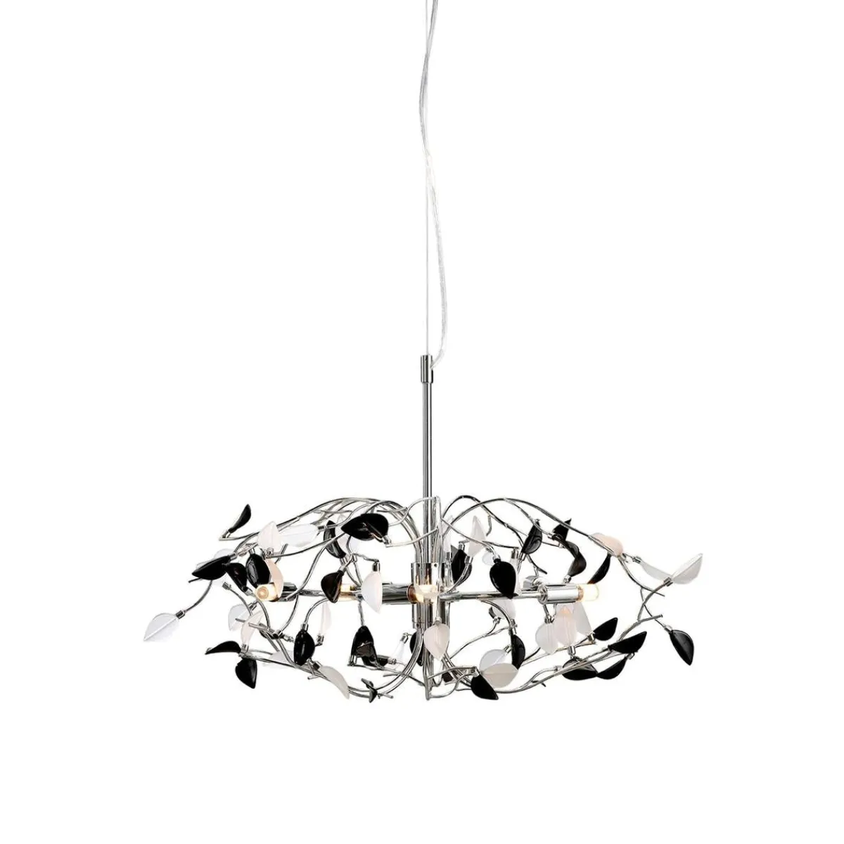 Iben-pendellampen i krom er en stilig lampe som kombinerer moderne design med klassisk eleganse. Med en diameter på 66 cm, en høyde på 35 cm og hele 74 glassblader i svart og hvitt, skaper den et unikt spill av lys og skygge. Lampen tilfører varme, hygge og personlighet til rommet, noe som gjør den til et opplagt valg for de som ønsker både funksjon og estetikk i interiørdesignet sitt.