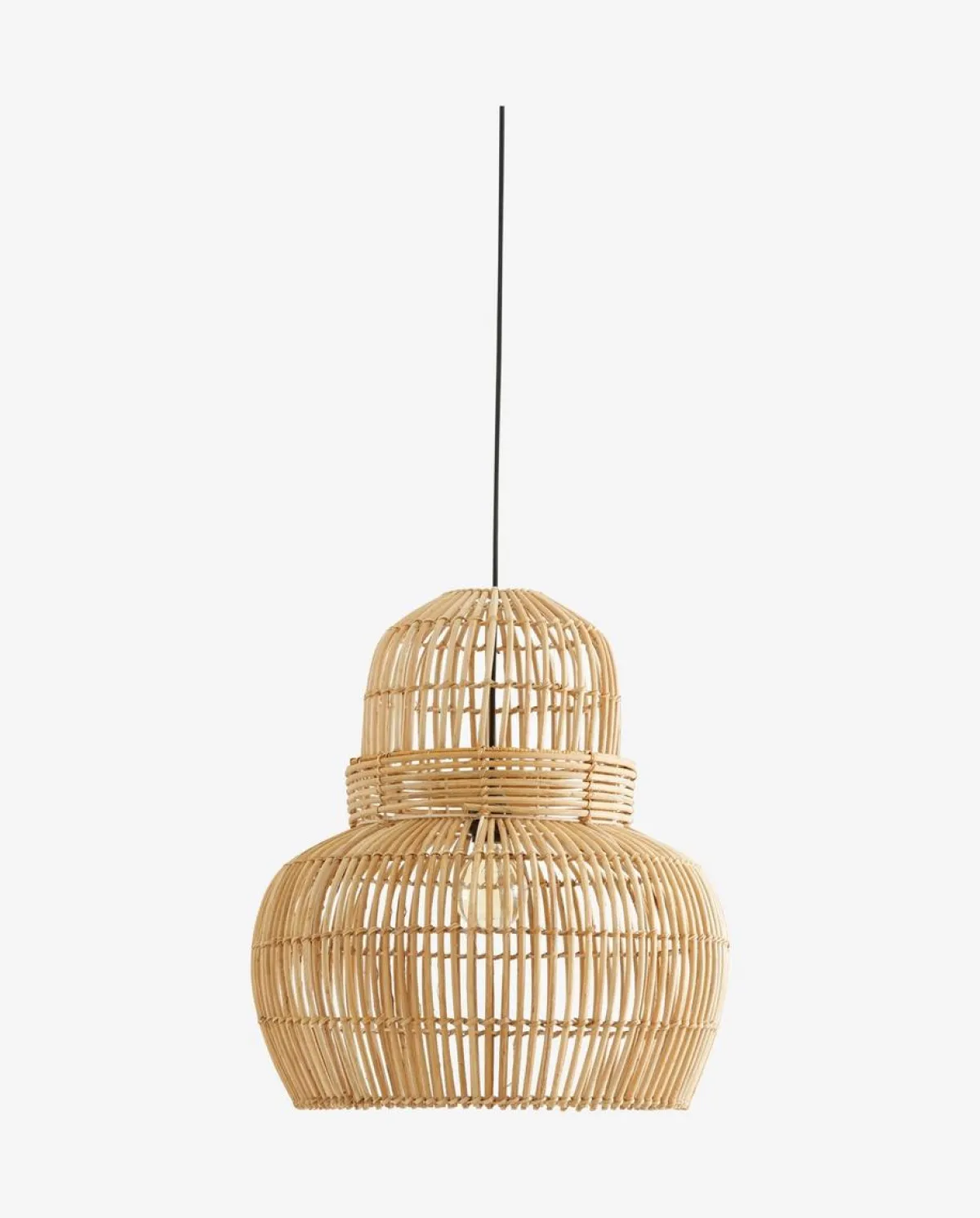 BUDVA lampeskjerm er laget av rotting med en naturlig finish. Lampens organiske form og utseende vil gi raffinement til enhver innredning. Balanserer perfekt mellom det voluminøse og det delikate, denne lampeskjermen gir rommet ditt en atmosfære av eleganse. Det tynne mønsteret skaper en sjarmerende refleksjon av lyset, noe som gjør at lampen ikke bare er praktisk