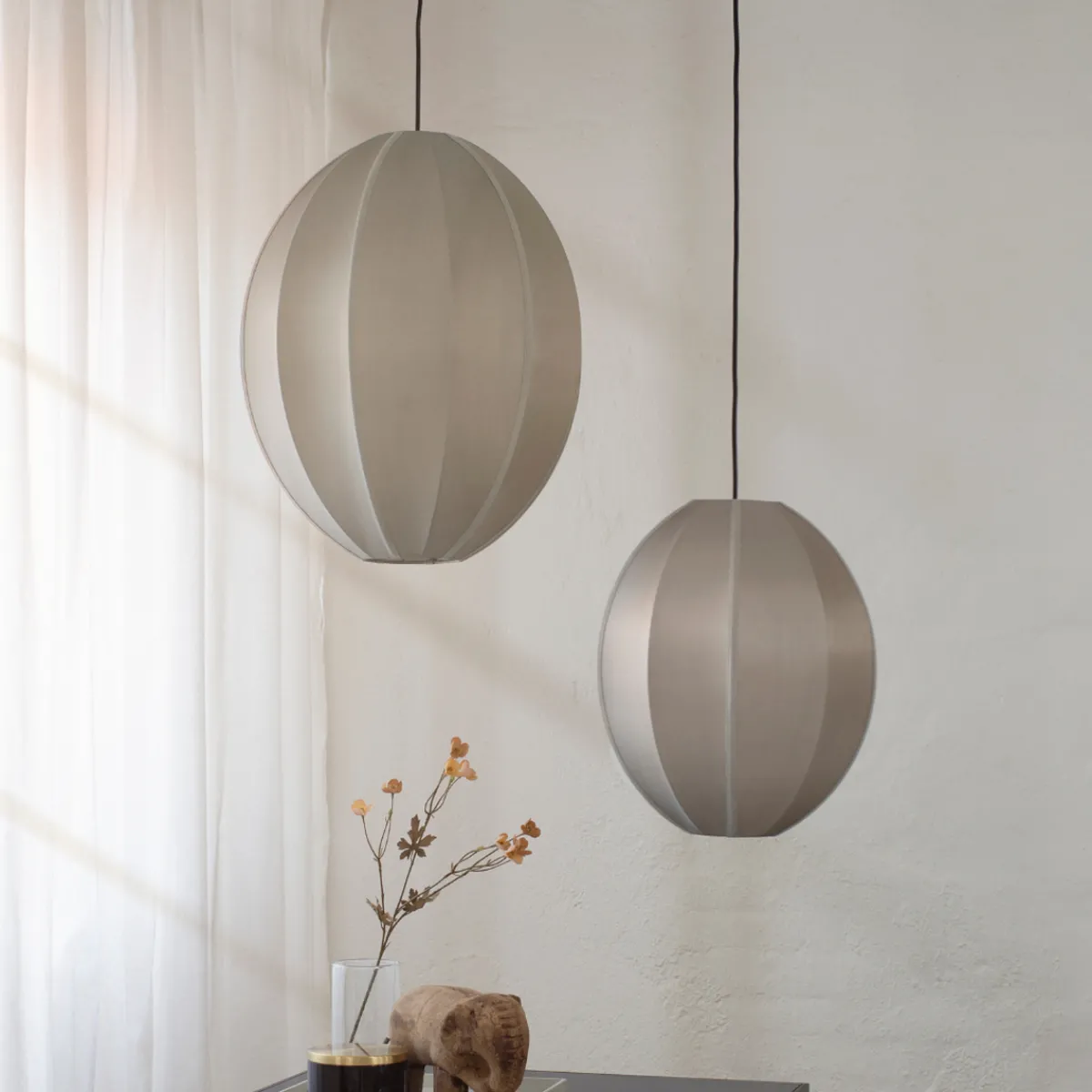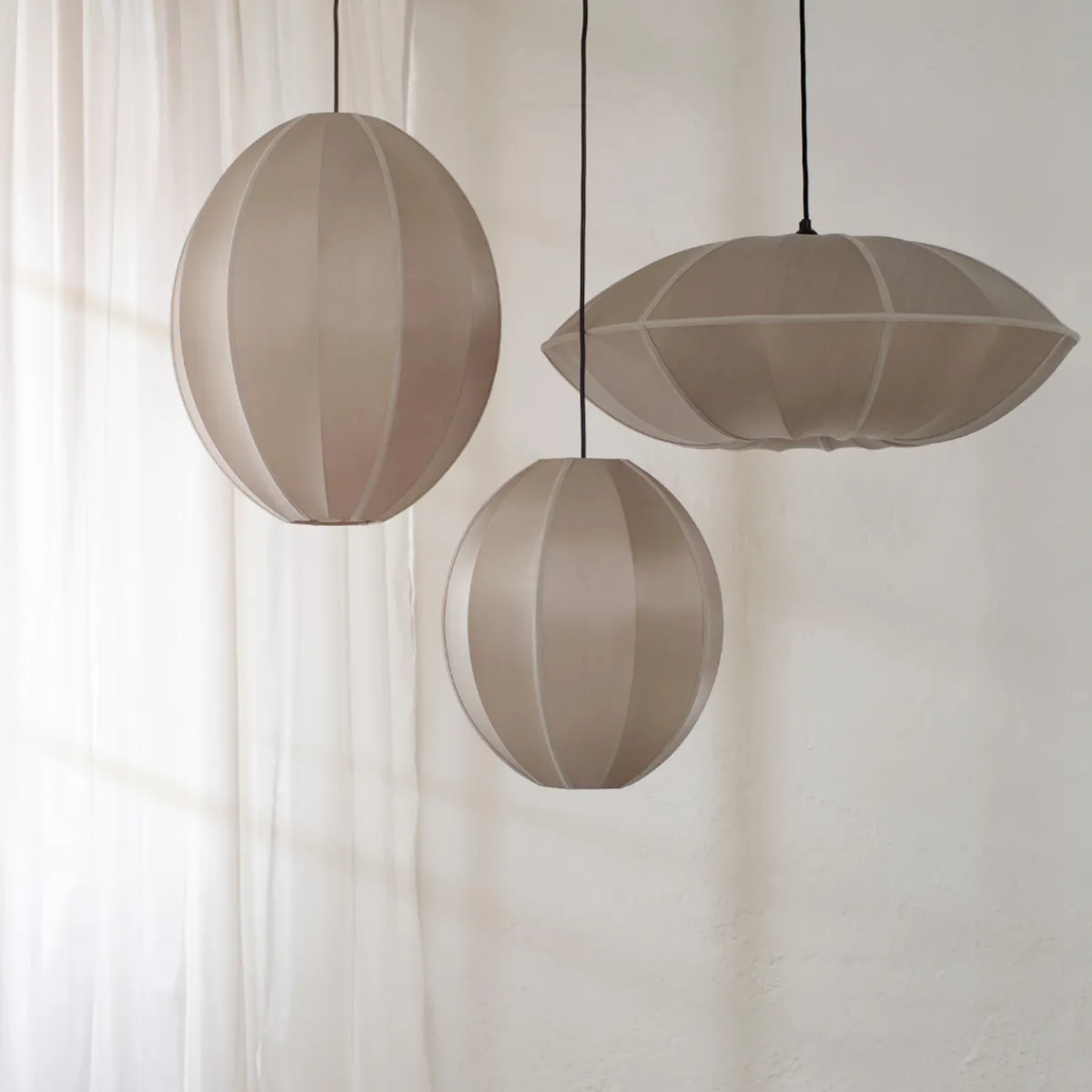 Oi Soi Oi lager noen av de vakreste taklampene vi har sett. Disse silkeskjermene kommer i forskjellige størrelser og fasonger. De henger fint alene og er fine i gruppe av flere.