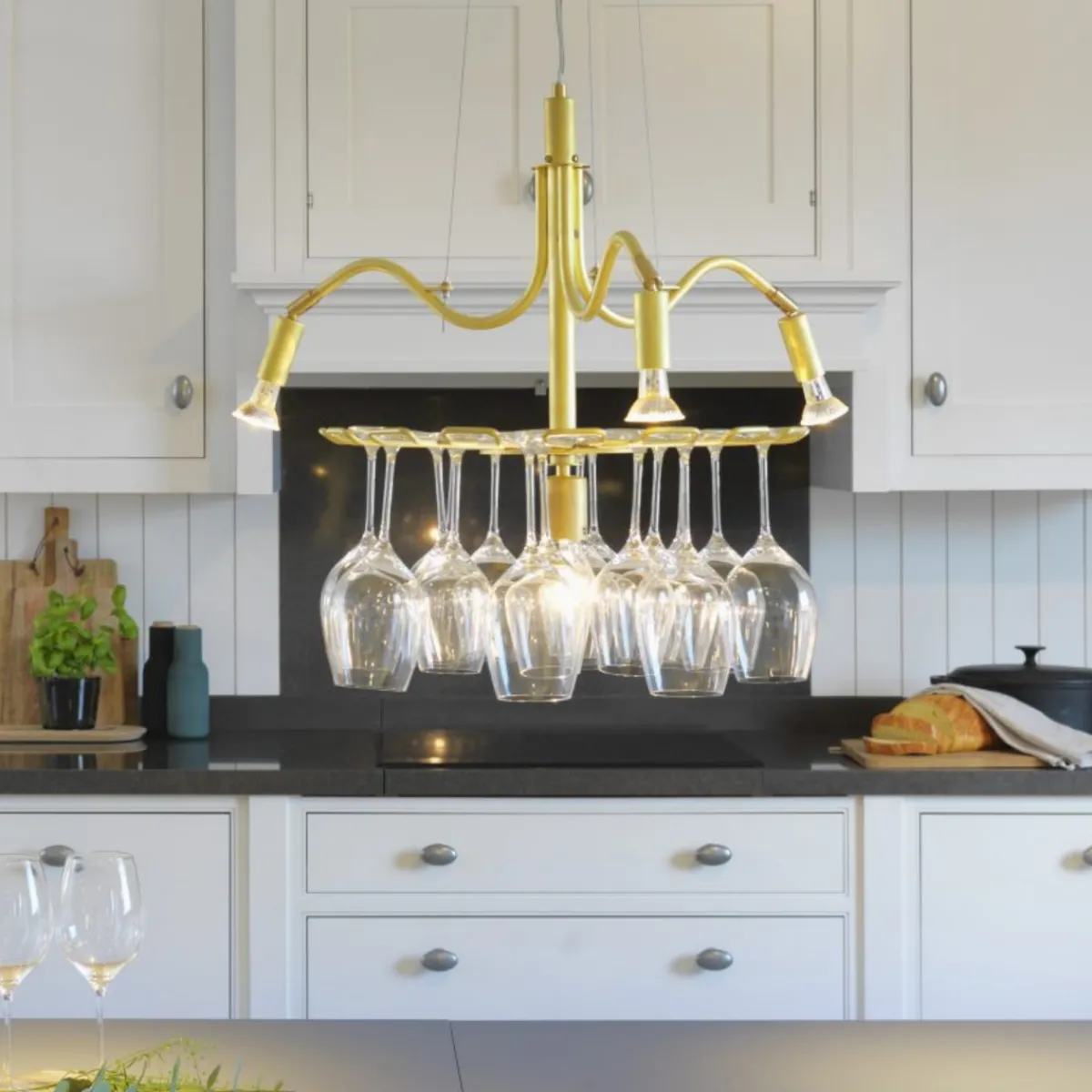 Lampen har plass til ca. 16 vinglass. Vinglassene er ikke inkludert. Du behøver 4 stk lyspærer med E27-sokkel til lampen.