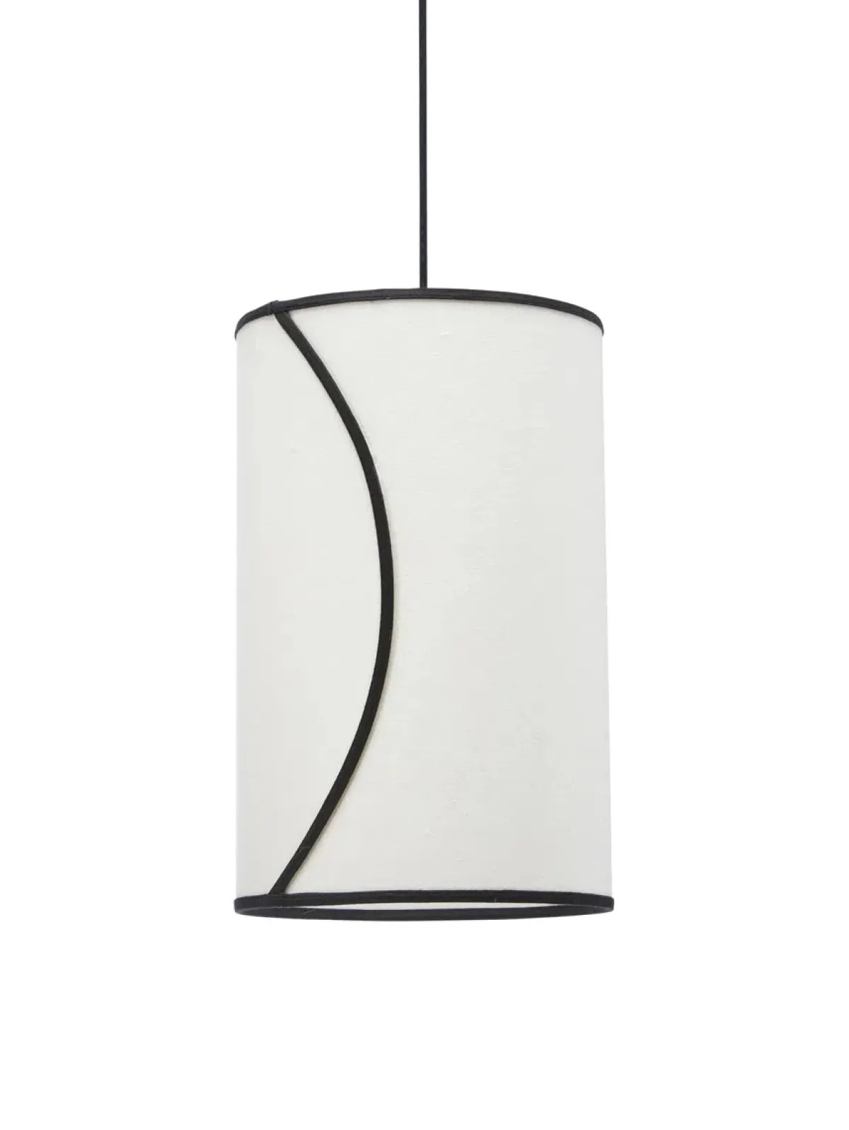 Pendel Ava. En sylinderformet pendelskjerm i økologisk bomullsstoff med hvit innside, de rene sorte detaljene gir lampeskjermen et moderne utseende. Når den er tent vil den gi et behagelig lys samtidig som den er et blikkfang. Diameter 30 cm, høyde 45 cm. E27 toppbeslag. Sort ledningssett følger med og er 1,2 meter langt med E27-brakett.
