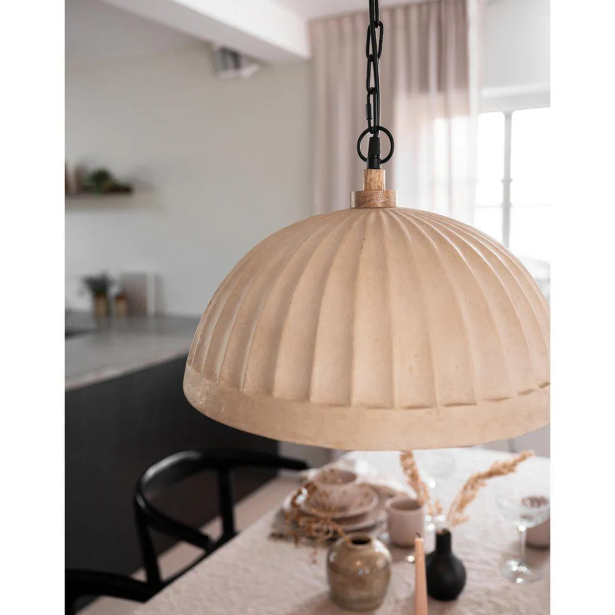 Lampen har en klassisk form med brede riller og en glatt kant nederst.