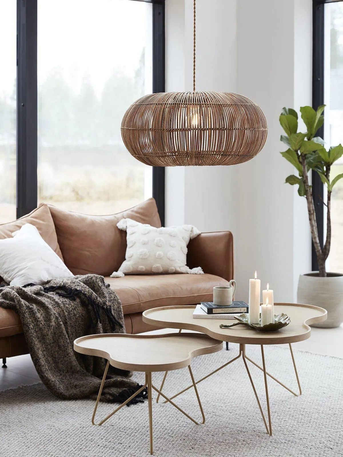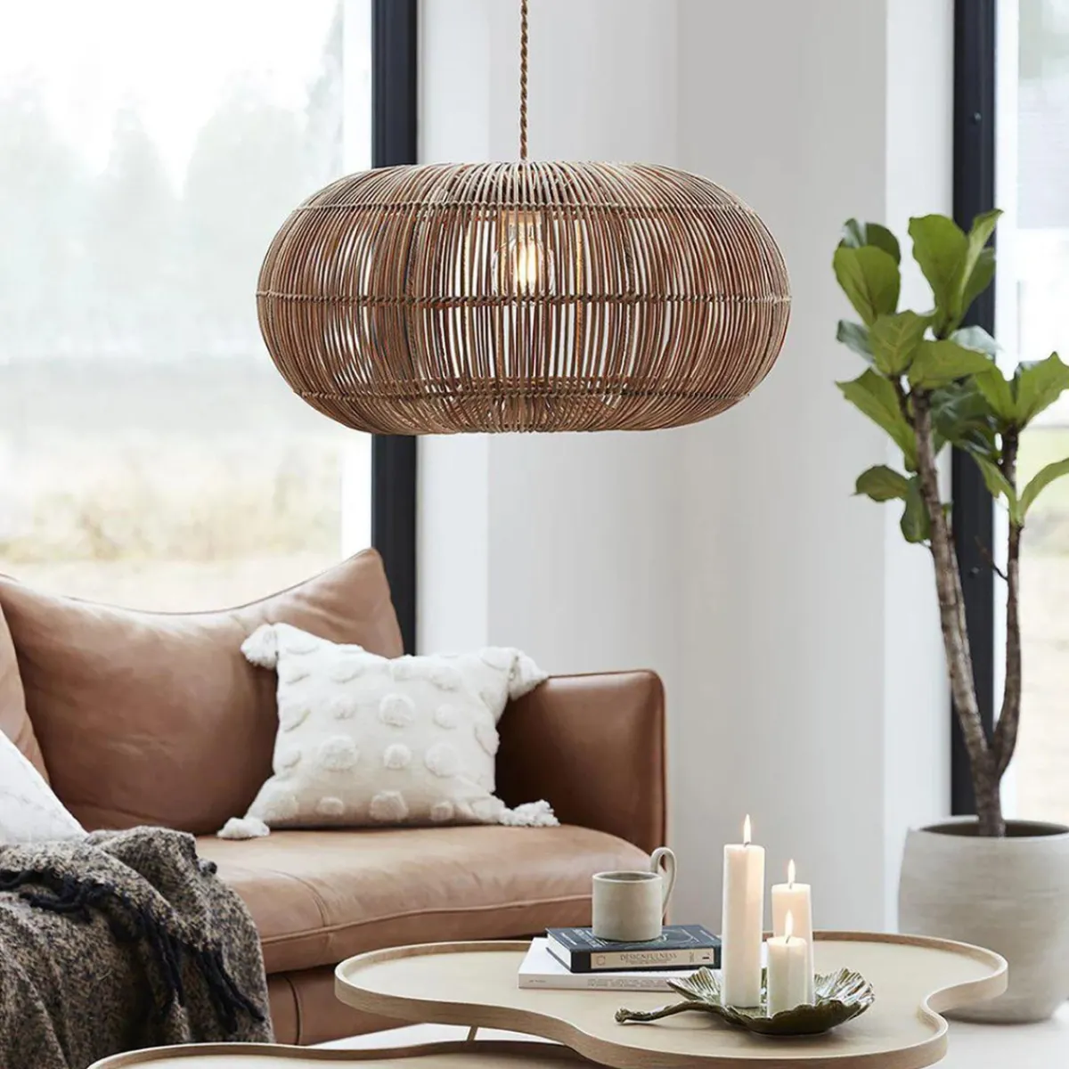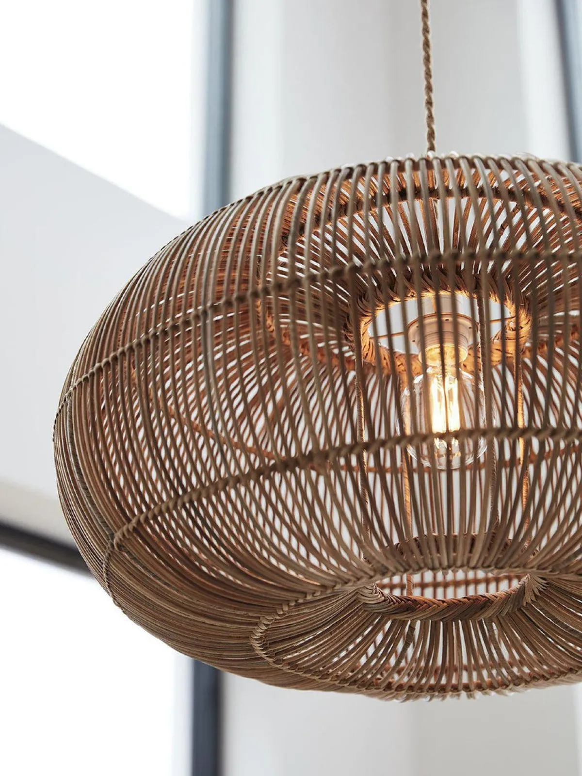 Zuri taklampe i håndflettet naturrotting. Skjermen er laget av formet rottingtråder som er vakkert flettet sammen og gjør hver skjerm unik. Skjermen har en organisk form som skaper en behagelig atmosfære. Siden den er laget av naturmaterialer kan det være mindre størrelsesavvik og fargen kan endre seg over tid. Lampen har en tvinnet jutefarget tekstilledning.