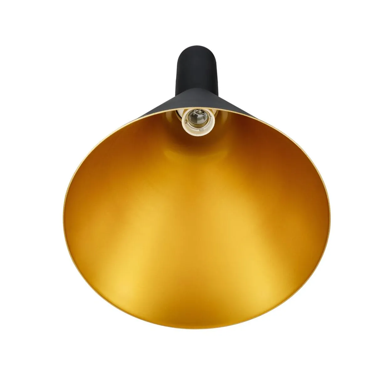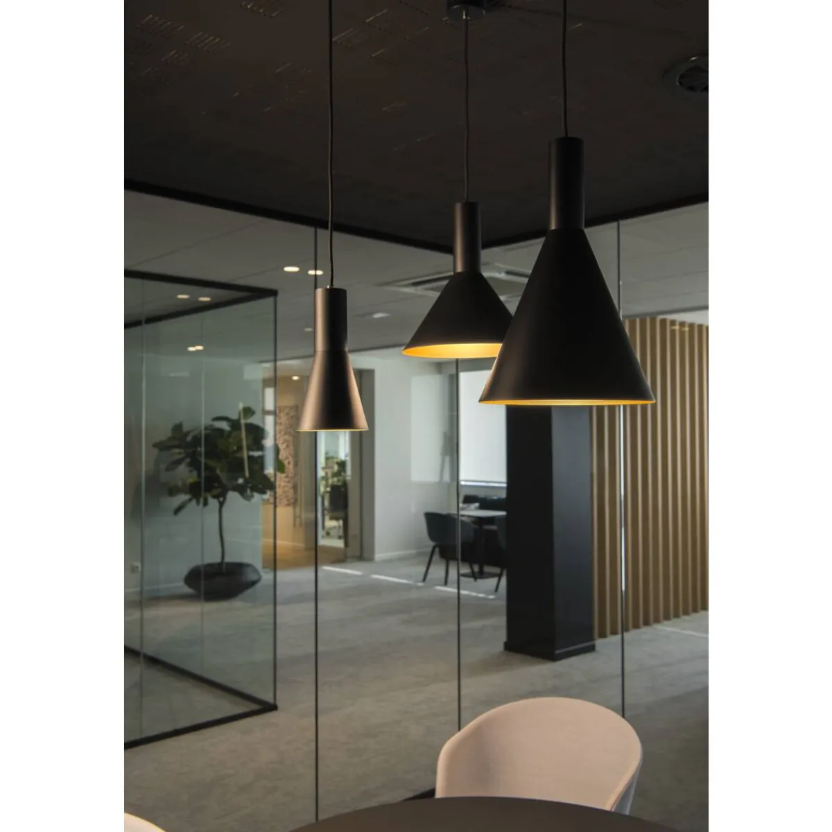 PHELIA er en 230V pendelarmaturserie i kjegleform og kommer i mange ulike varianter. armaturet er i sort/gull og har en rund takrosett. Den integrerte E27-sokkelen gjør armaturet velegnet for LED- og sparelyskilder. armaturets pendellengde er på 200 cm.