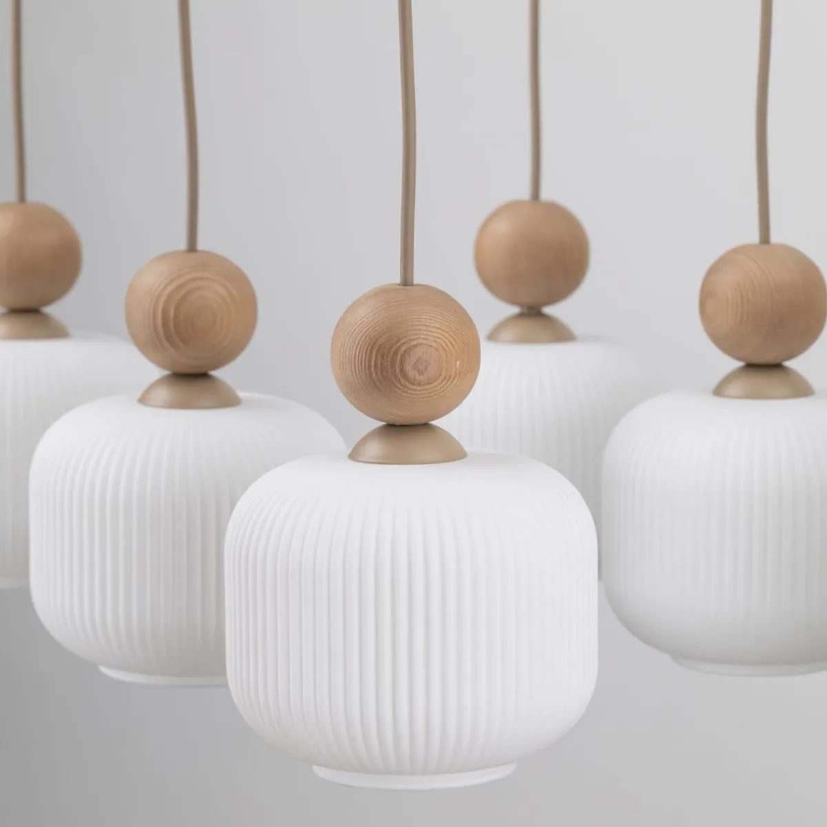 BALLO- lampefamilien er en elegant belysningskolleksjon som kombinerer moderne stil med naturlige aksenter. Et særegent trekk ved serien er de riflede, melkehvite glassskjermene, som subtilt diffunderer lyset og skaper en koselig atmosfære i ethvert interiør. Dekorative trekuler plassert over skjermene gir også et varmt og organisk preg. Det hele kompletteres av en Beige-farget baldakin – en lys, sandbeige som perfekt utfyller lampenes delikate form. BALLO- kolleksjonen er tilgjengelig i flere versjoner, noe som gjør den enkel å tilpasse til ulike rom og designbehov.