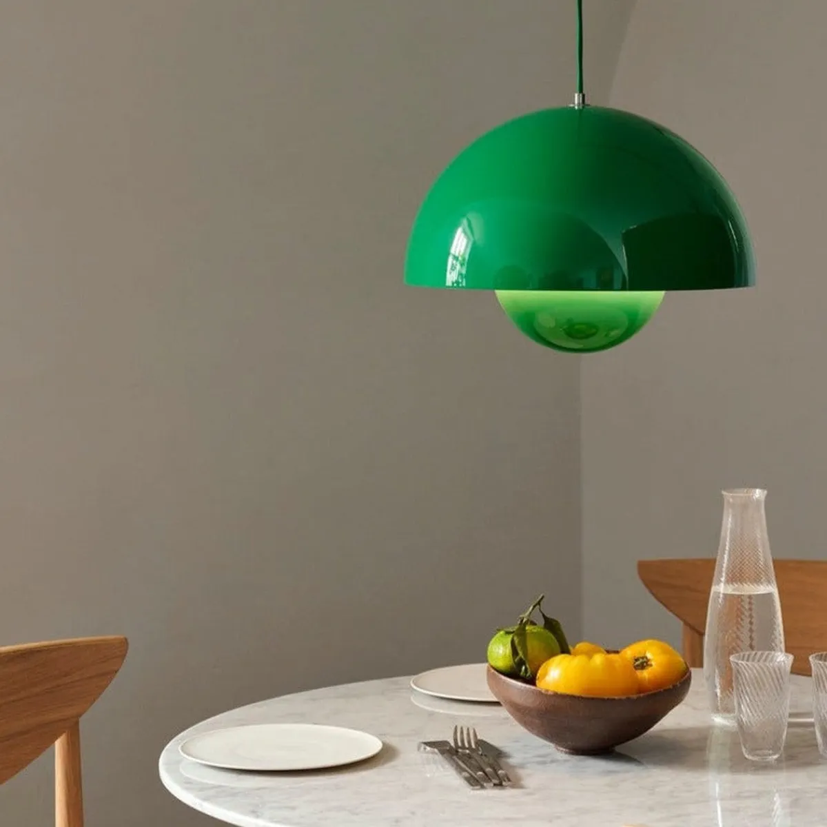 Lampen er like moderne i dag som for snart 50 år siden, og er fremdeles en klassiker blant lamper. Den finnes i flere størrelser og farger. Lampen består av to halvkuler med lyskilden skjult i mellom, og man får derfor et indirekte og behagelig lys. Like fin over spisestuen som over salongbordet.