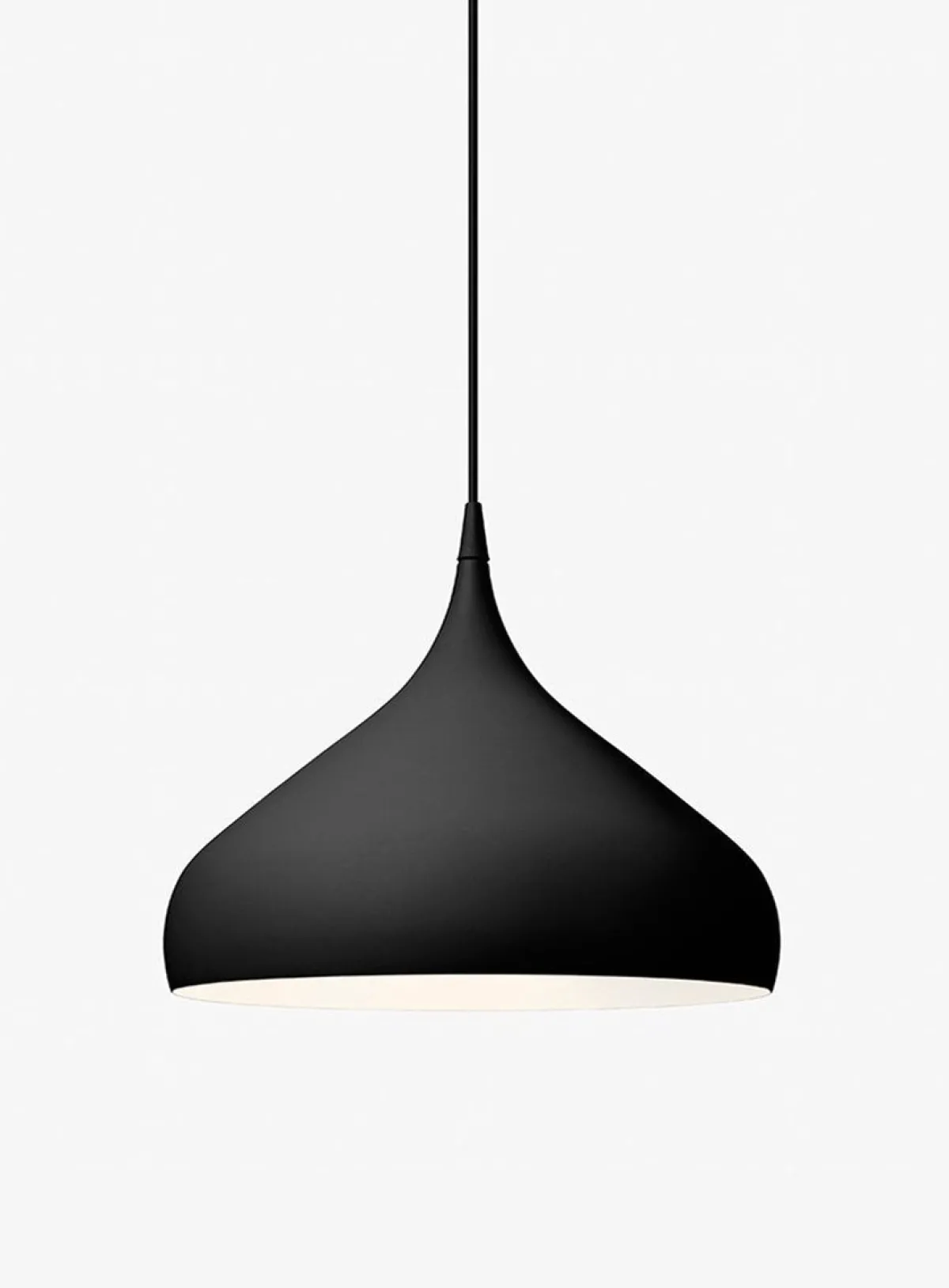 Spinning Takpendel fra &tradition i pulverlakkert aluminium. Lampens inspirasjon er hentet fra barndommens leketøy- en snurrebass. Lampen er laget ved nettopp å snurre et stykke metall til den formen lampen har. Innovasjon møter funksjon, og en får en leken lampe med myke former som du kan ha mye lys i uten å blendes. Derfor er den like fin over spisestuen som over kjøkkenbordet for arbeidslys. Finnes i flere farger.