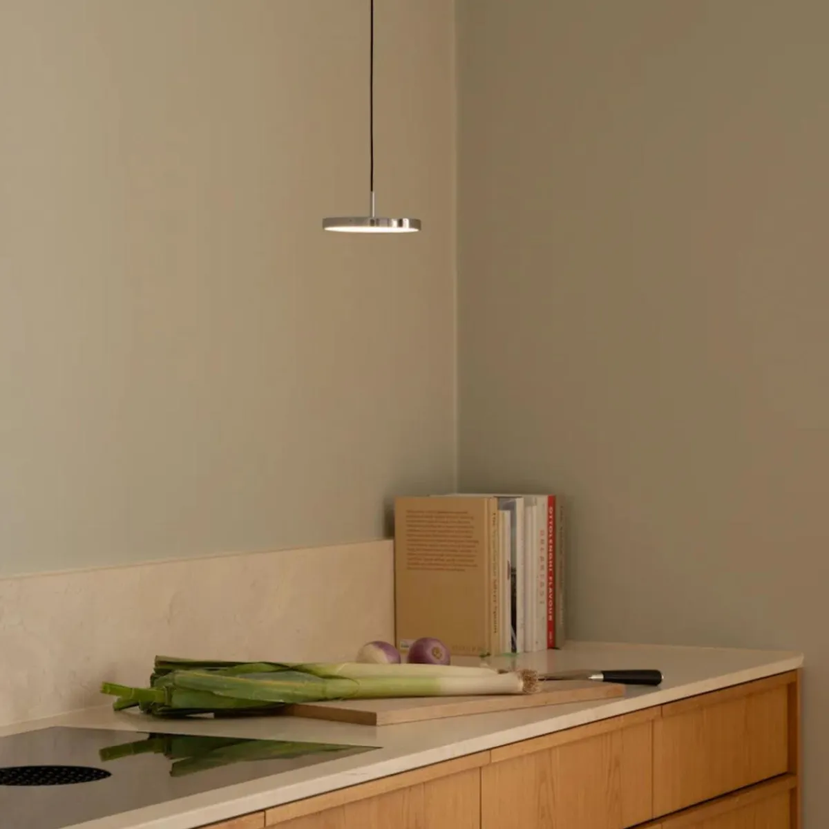 Lampens uttrykk er enkelt, minimalistisk og klassisk, noe som gjør den perfekt til alle omgivelser. Heng Asteria Micro alene eller flere sammen over kjøkkenbenken for å få praktisk belysning når du lager mat med familie og venner.