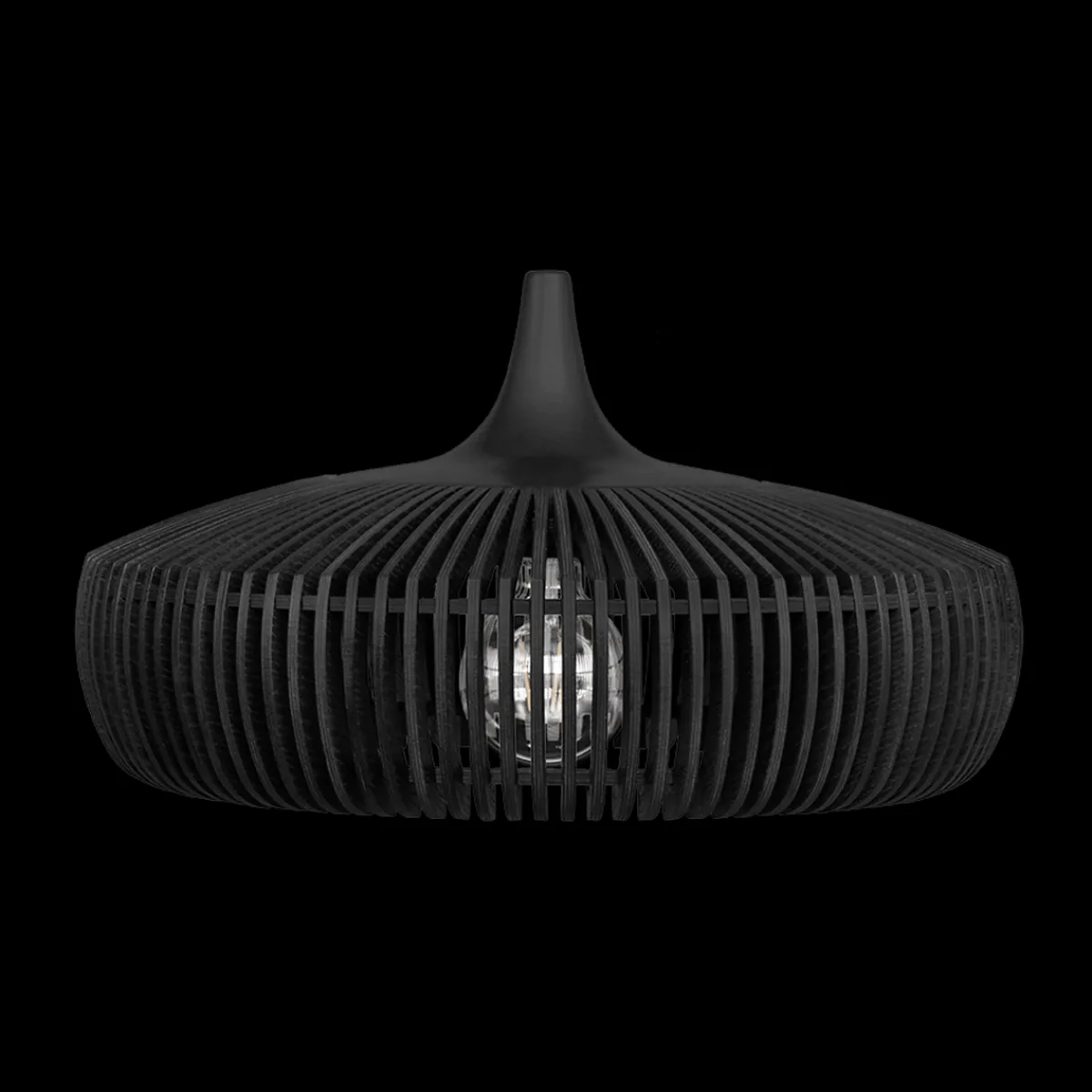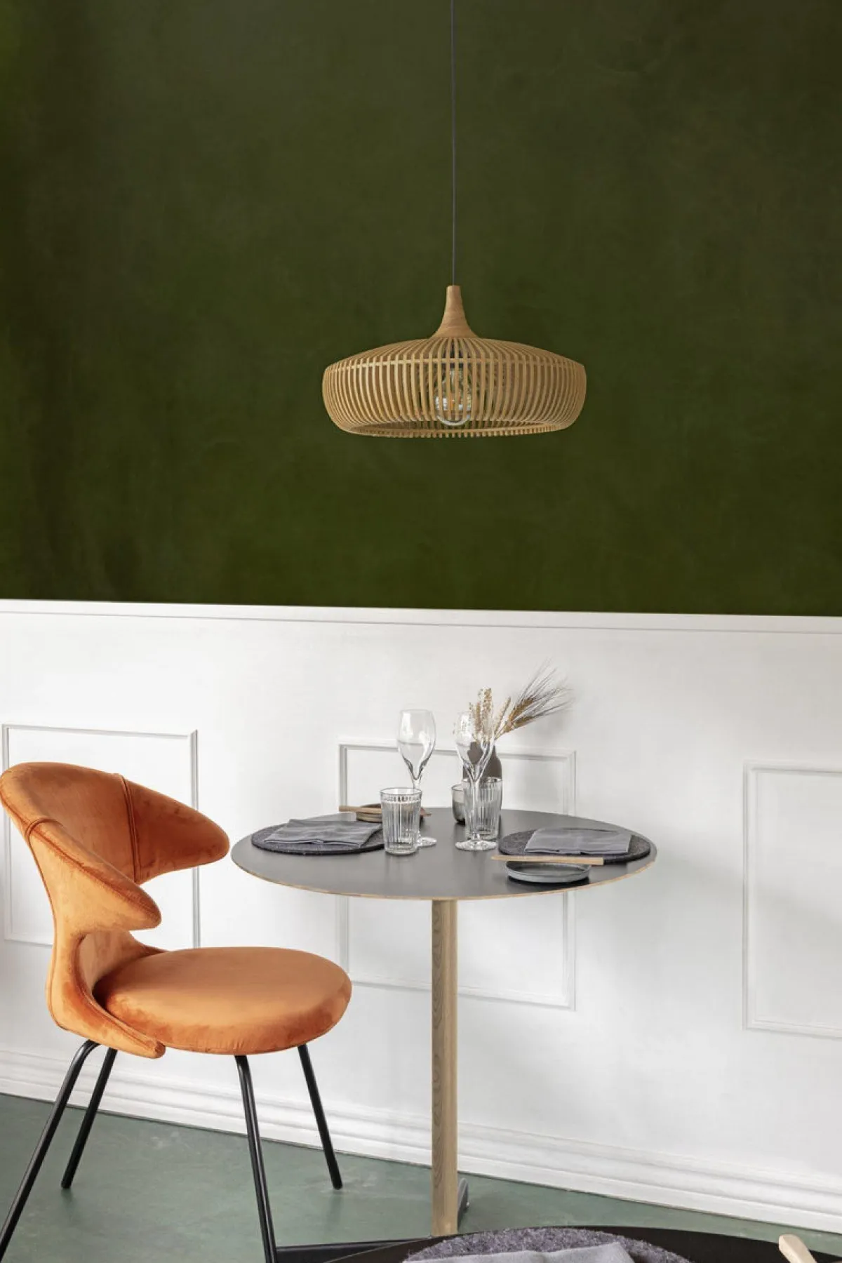 Clava Dine Wood-lampeskjermen er designet av en håndverksteknikk som krever en unik presisjon og nøyaktighet på grunn av den lille avstanden mellom hver lamell. Tre lamellene er laget av laserskåret ask og finér av eik med solid eik. Lampeskjermen skiller seg ut som et skulpturert designverk som skaper en lekende lysglimt på veggene i det omkringliggende rommet. Lampehettenes troskap skaper et vakkert mønster som kan beundres fra alle vinkler, både på innsiden og på utsiden av lampeskjermen.