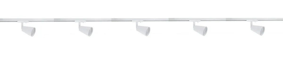 Komplett 2 meter spotskinne med 5 spotter. Lyspærer kjøpes separat med GU10 sokkel.