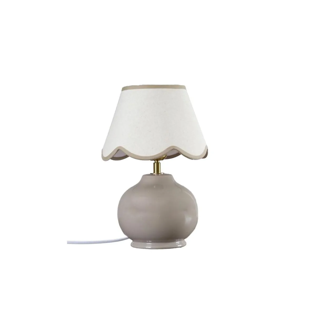 Nell bordlampe er en komplett lampefot med tilhørende skjerm. Den har en kuleformet lampefot i keramikk og en linlignende skjerm med bølget kant og matchende kantbånd. Lampens totale høyde er 35 cm, og den måler 23 cm i bredde og dybde.