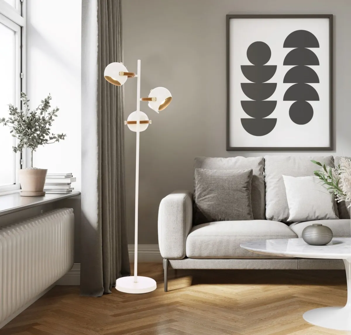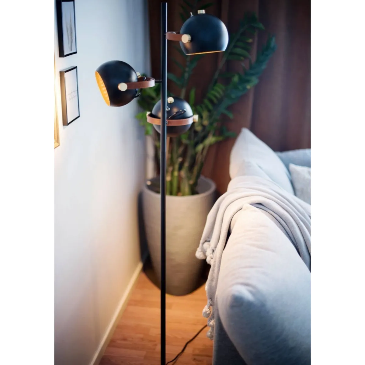 Bow gulvlampe i hvit med detaljer i krom og brunt lær. Lampehodene kan justeres til ønsket posisjon. Hovedmaterialet i lampen er metall/lær. Max wattstyrke er 3x7W og lyskilde er ikke inkludert. Strømbryter på lampehodene. Ledningen er 215 cm lang. Trendy gulvlampe i skandinavisk design.