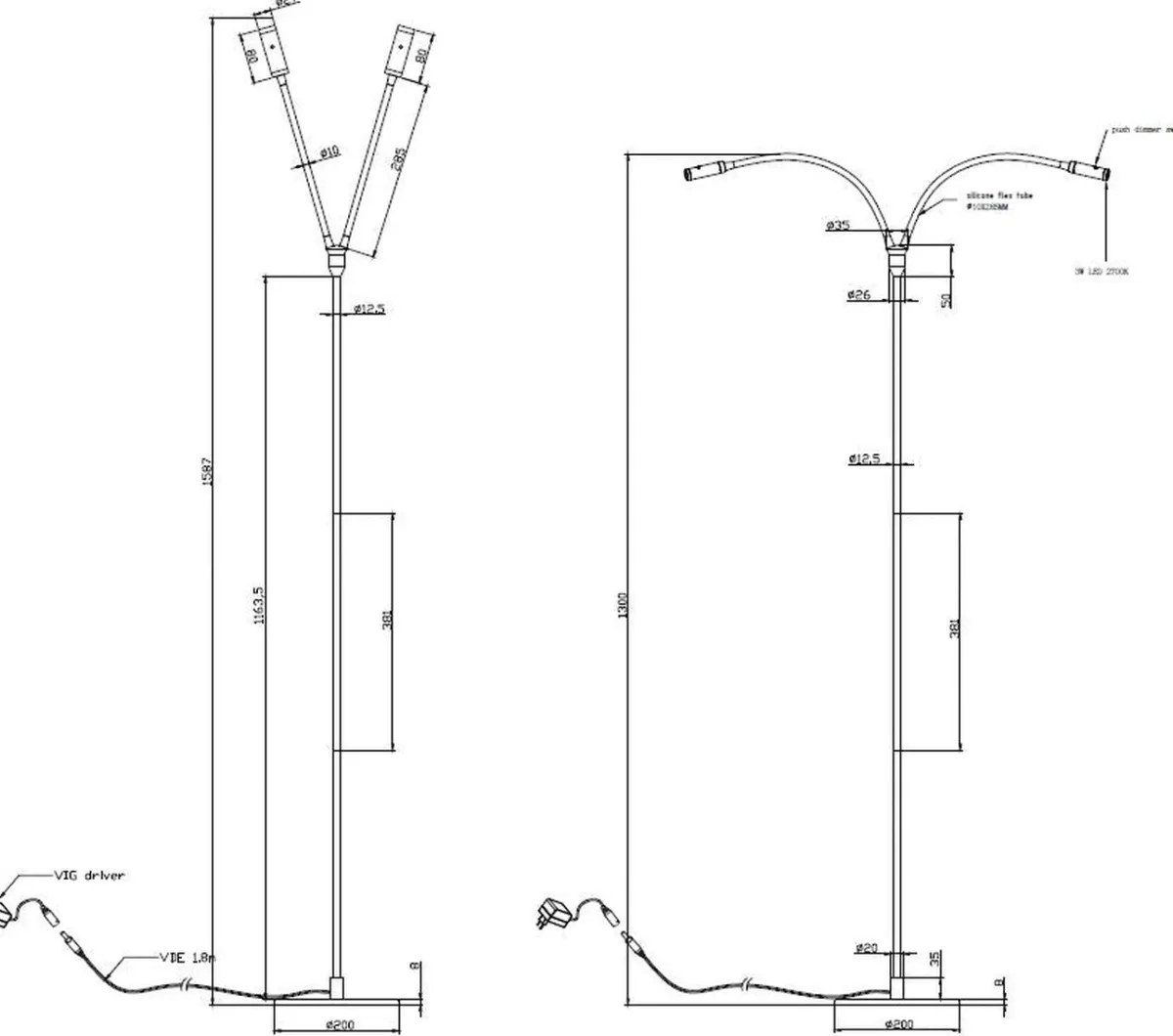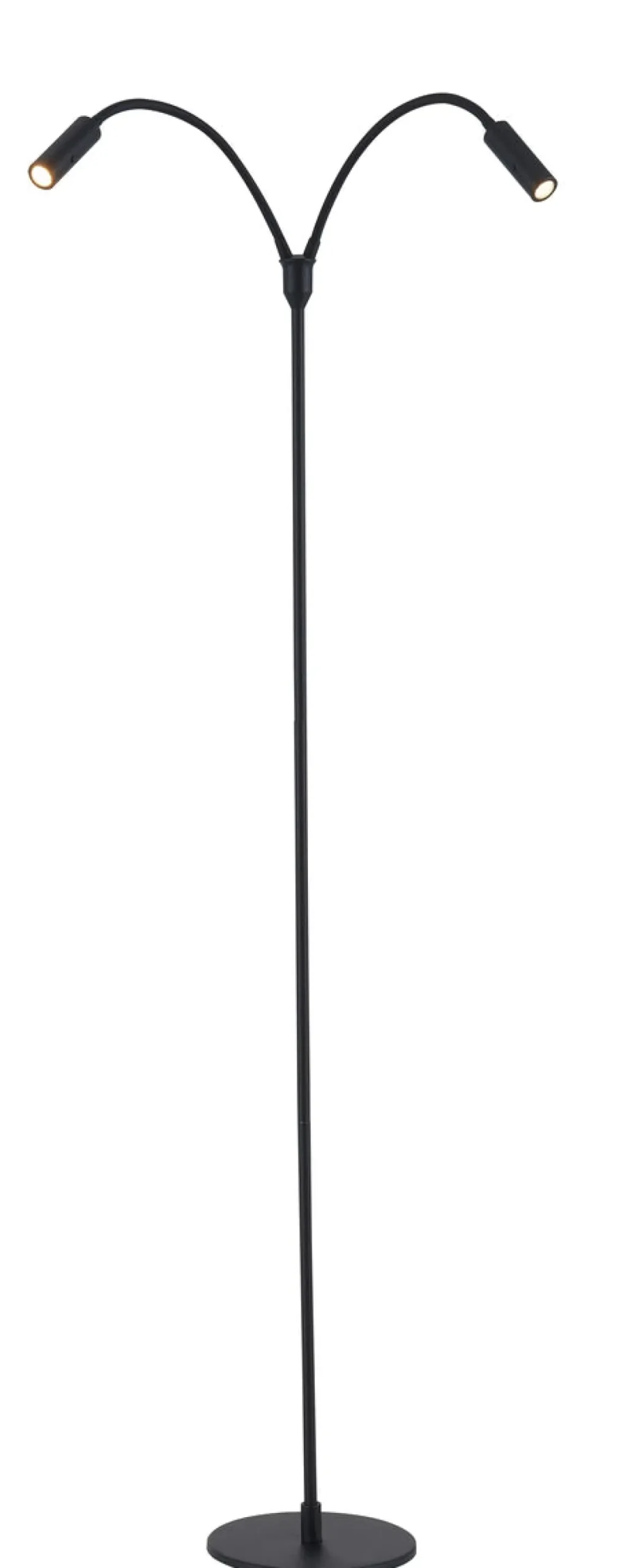 Gulvlampe med to lys. Begge lysene har individuelle push-dimmere på lampehodet. Armene er fleksible og kan bøtes i alle retninger.
