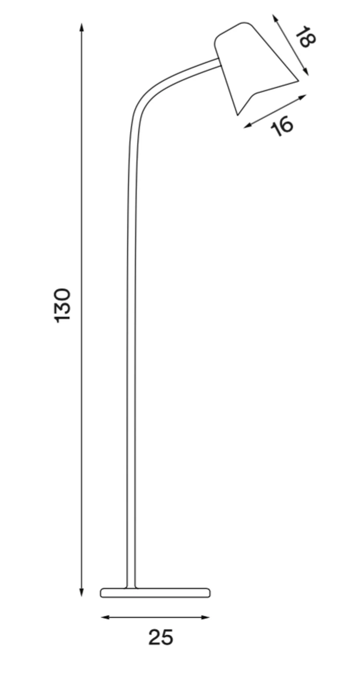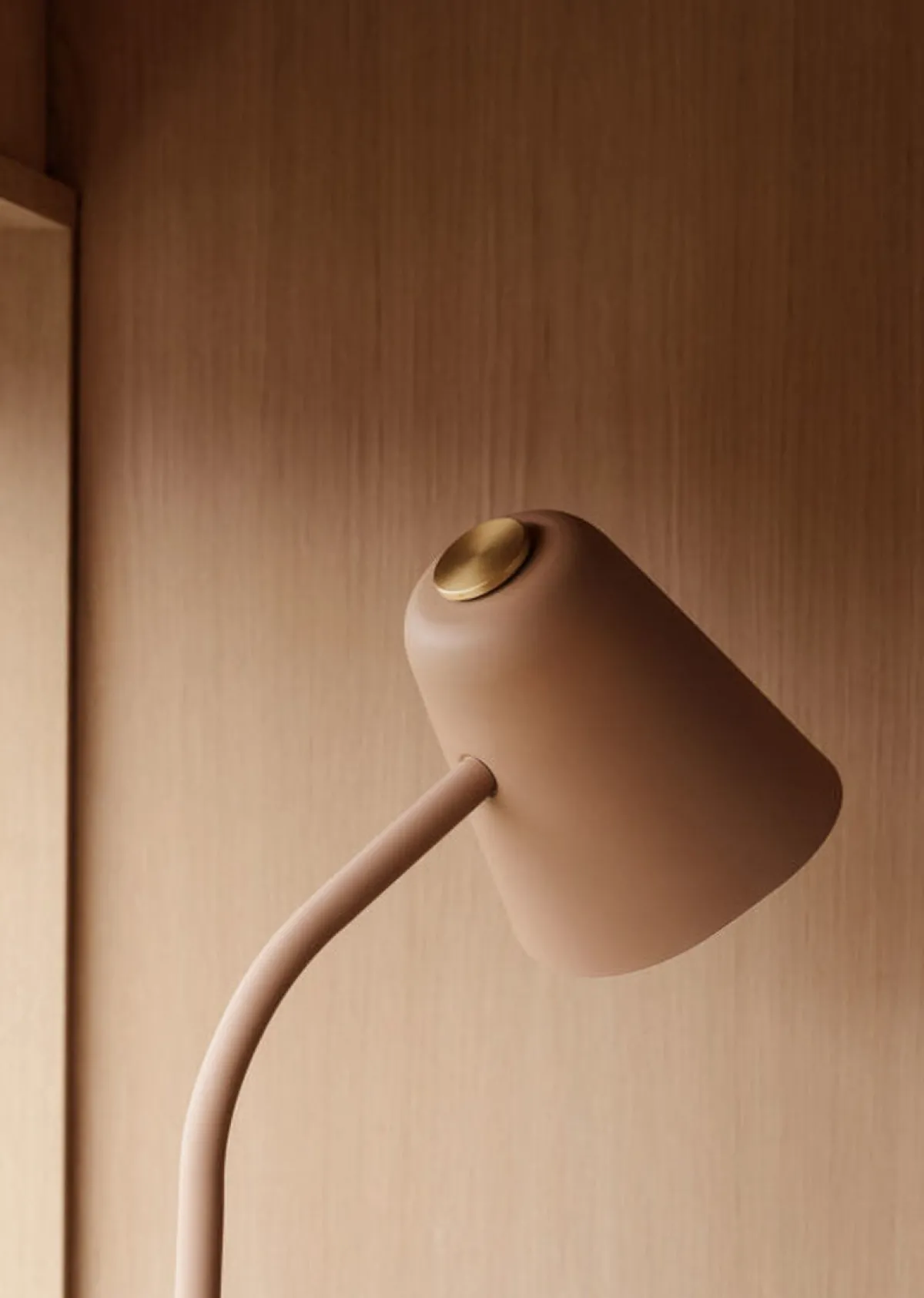 Me gulvlampen ble designet av Morten & Jonas i 2015. Lampen er meget fleksibel da armen er bevegelig 360° og du kan styre lyset dit du vil. Her får du direkte lys uten å blendes, og lampen har integrert LED lys. Lampen er silikonbelagt, og er derfor strømlinjeformet. God og myk å ta på. Lampen har også en dimmebryter i pen messingdetalj på toppen av hodet.
