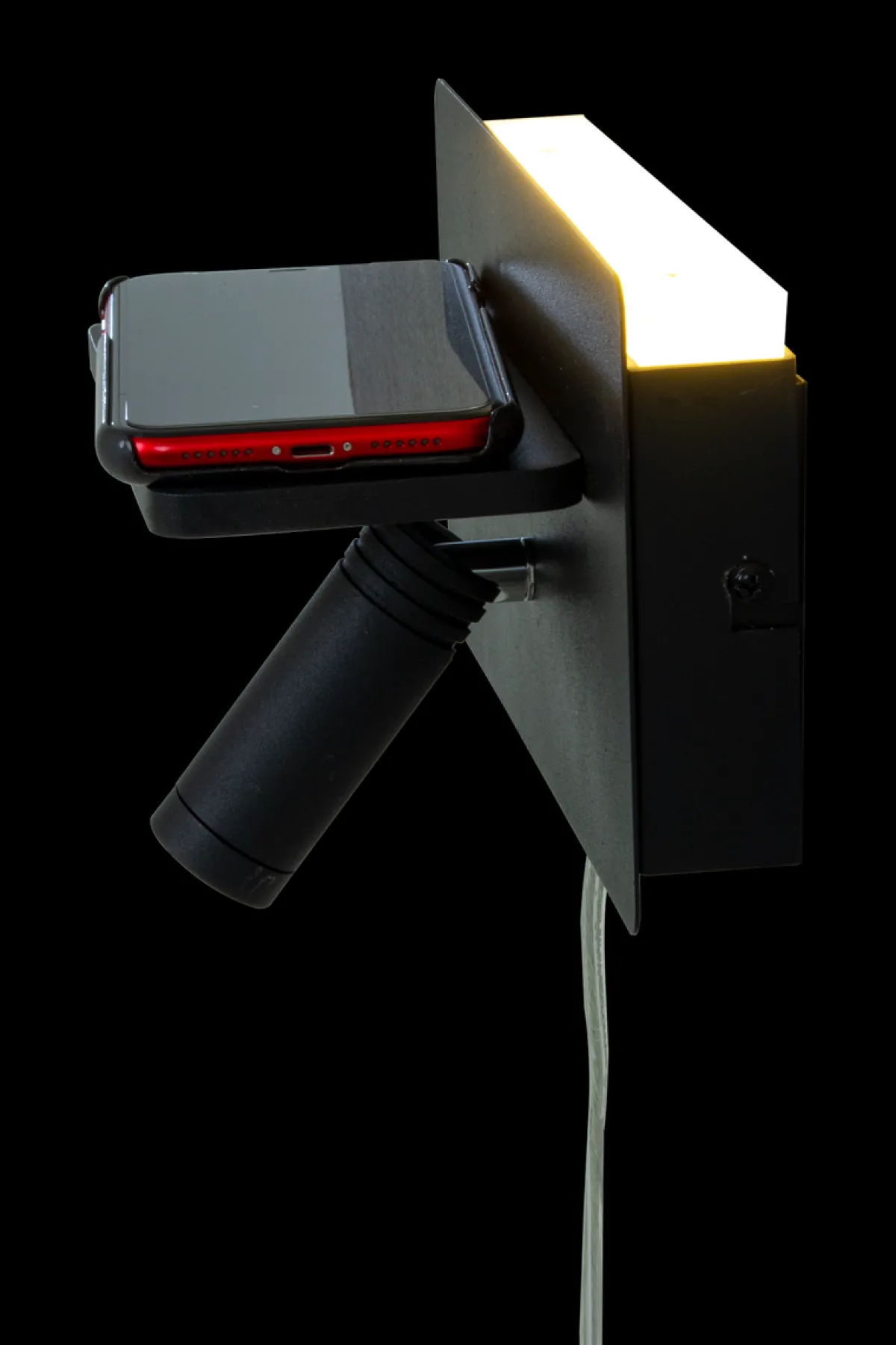 Cargador er en praktisk vegglampe med trådløs lader for mobil telefonen. Har praktisk leselys og dekorativt lys ovenfor lampen som lyser opp veggen.