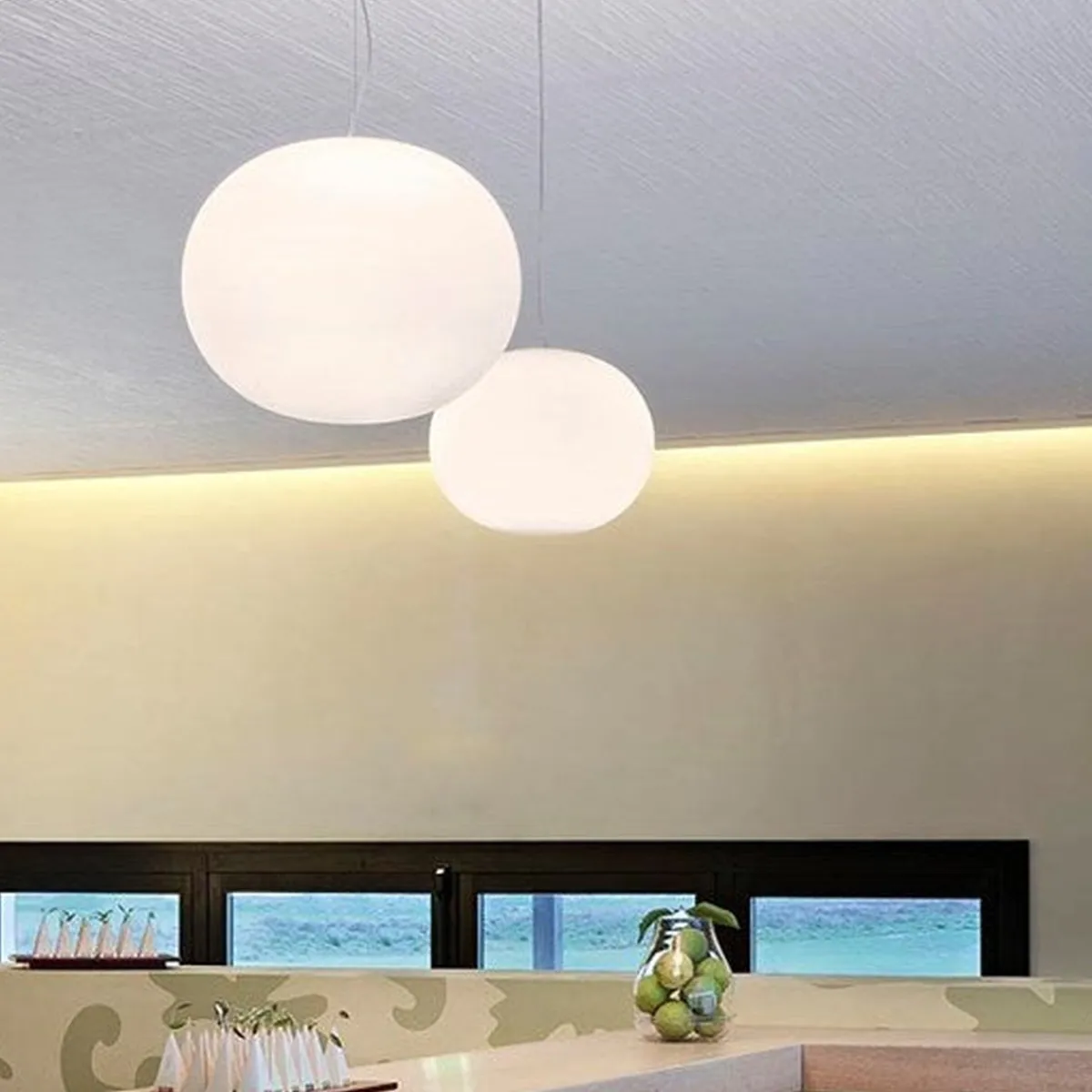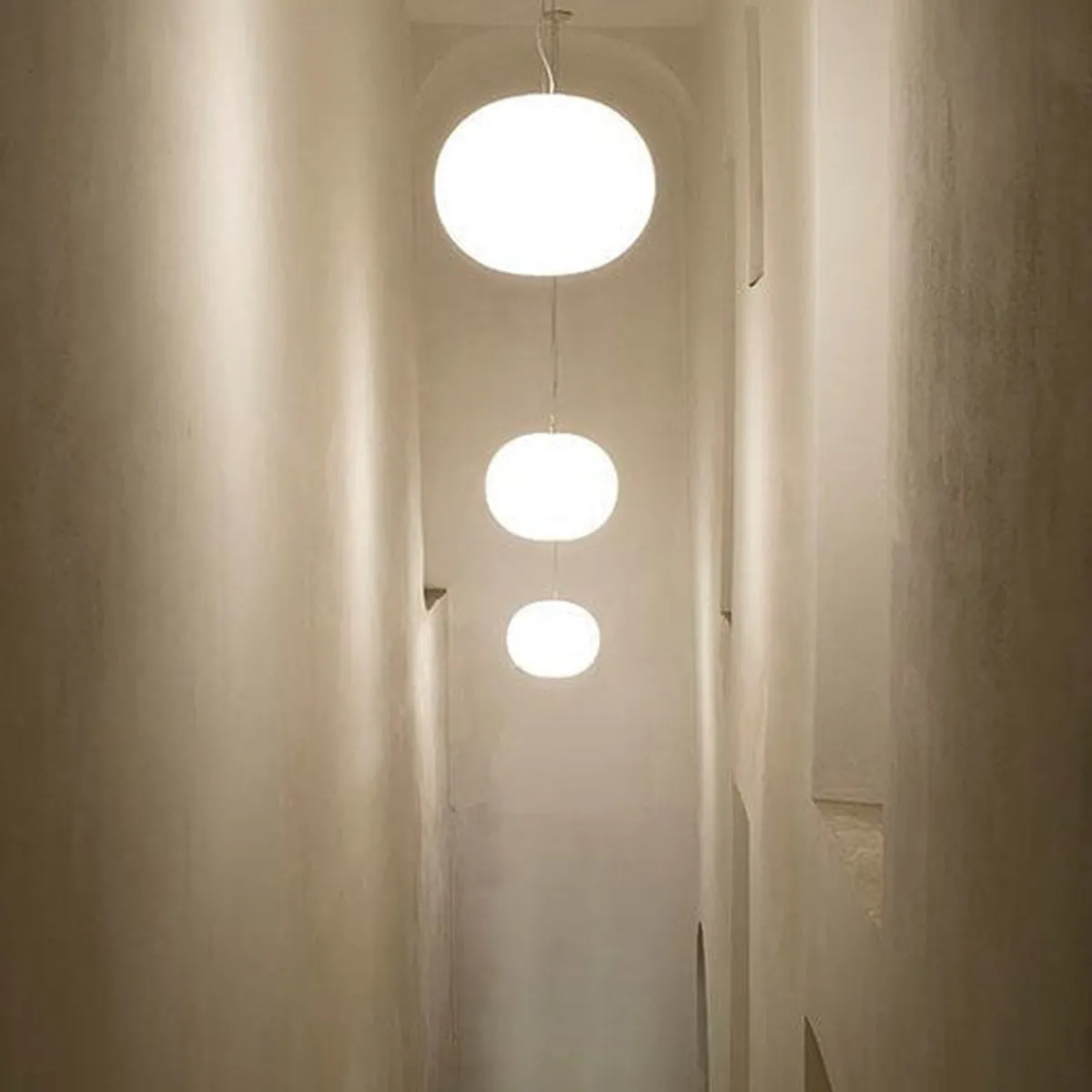 FLOS Glo-Ball S1 takpendel er en enkel men genial lampe. Den enkle formen kombinert med godt, generelt lys gjør denne lampen til en meget anvendelig lampe som passer i de fleste rom. Den er laget av ett stykke hvitt, munnblåst glass og minner mest om en måne med jevn, generell belysning. Glo-Ball er en del av en stor serie bordlamper, gulvlamper, vegg- og taklamper. Designet av Jasper Morrison i 1998. Lampen er flott å bruke over spibord, over salongbord, på soverom, i trappeoppgang og i en gang dersom du har god takhøyde.