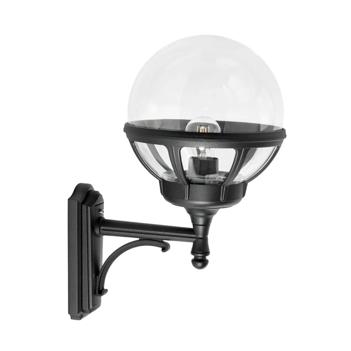 Oppovervendt vegglampe i klassisk design. Glasskuppelen er i klar farge og består av slagfast PMMA. Lampen finnes også med opalhvit kuppel.