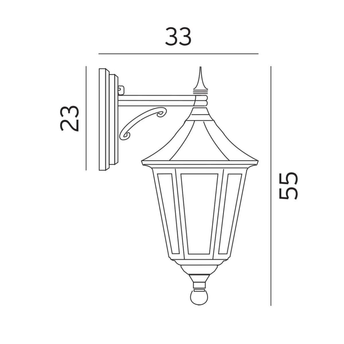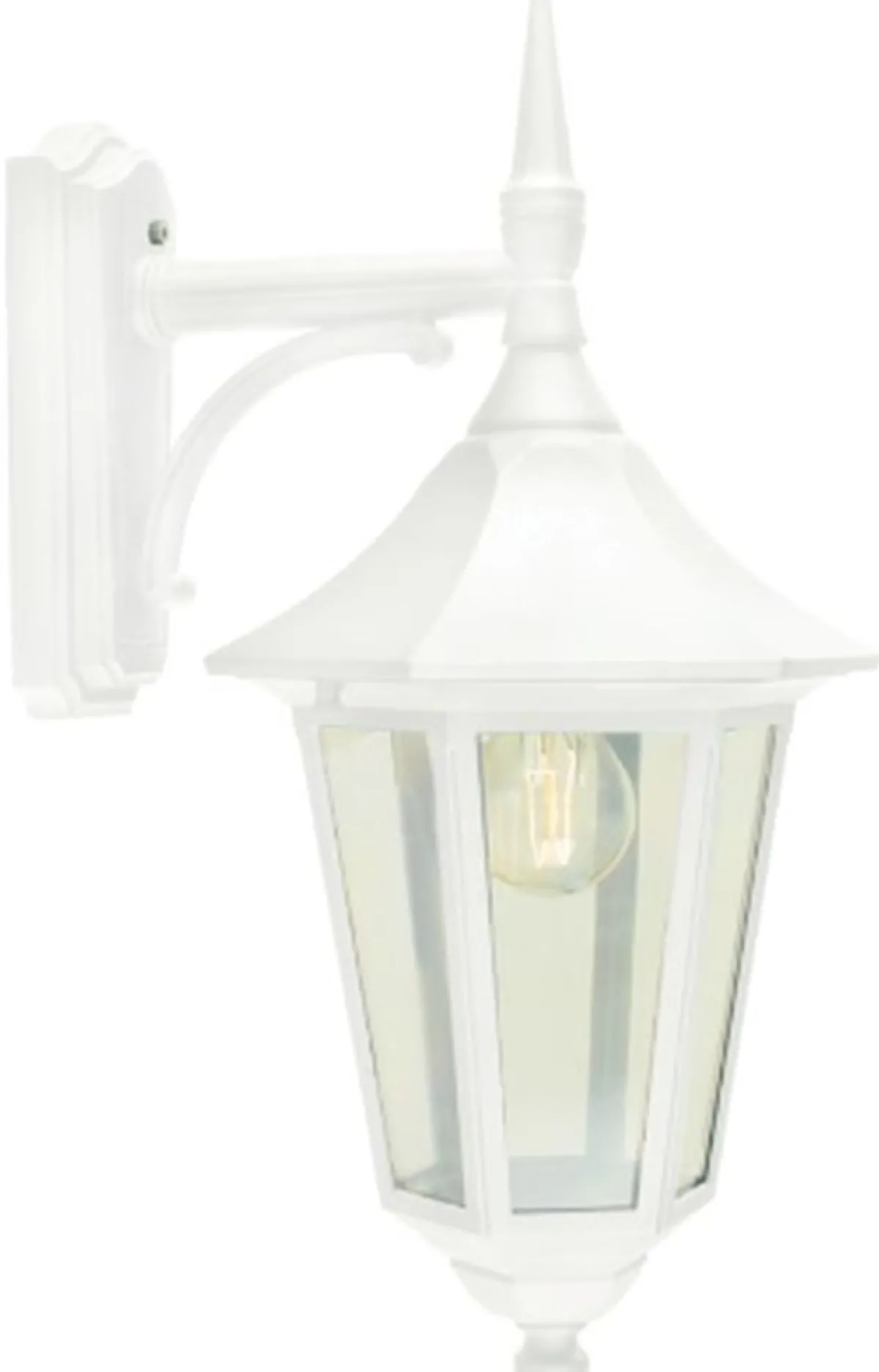 Vegglampe i klassisk design. Glass av slagfast klar polykarbonat. Utelampen er vendt ned.