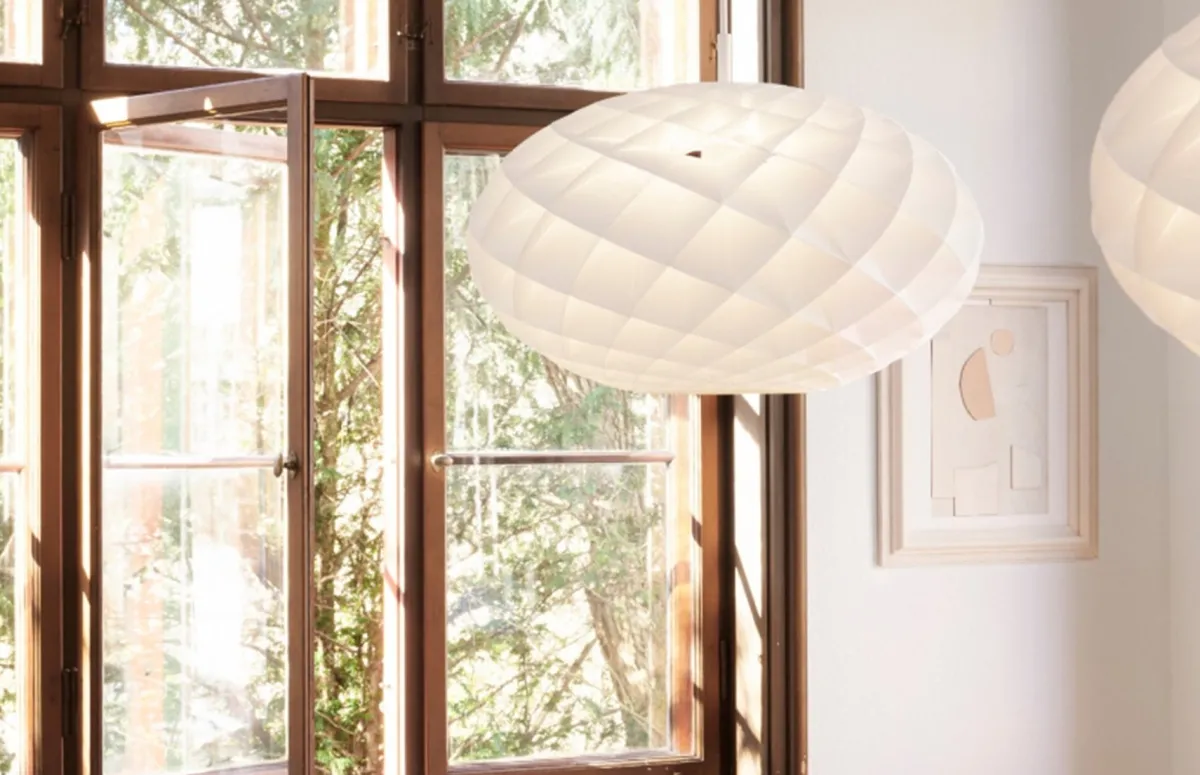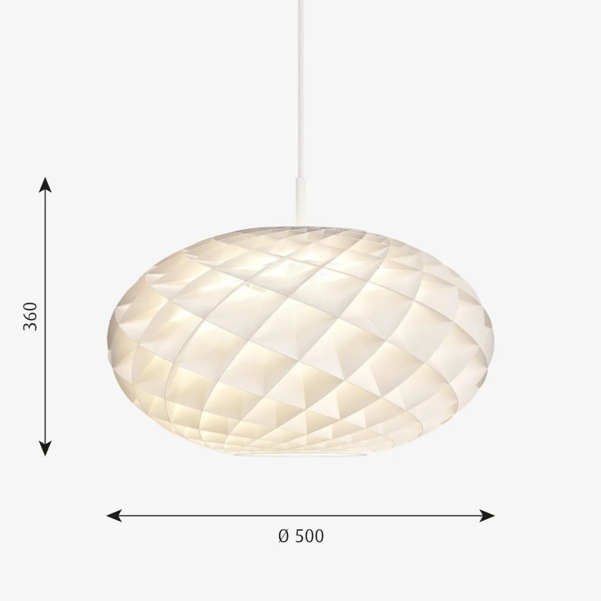 Patera pendelen er vakker å se på fra alle vinkler, lampen er bygget opp av små, diamantformede celler som er nøye designet for å reflekter blendefritt lys når de betraktes fra en vinkel på over 40 grader. Lampen avgir et 360 graders lys som bader omgivende rom i et naturlig, jevnt og behagelig lys. Under 40 grader gir lampen direkte, nedadrettet lys. Den runde åpningen under gir direkte lys med en myk overgang mot det reflekterte lyset. Pendelen kan brukes med eller uten avskjermer, avhengig av om lyskilden skaper uønsket blending eller ikke. Patera er en stemningsskapede lampe som gir et løft til ethvert rom. Patera er tidløs og følger de samme elegante designprinsippene som den sirkulære Patera og settes sammen helt for hånd, etter den matematiske strukturen til den fengslende Fibonacci-spiralen.