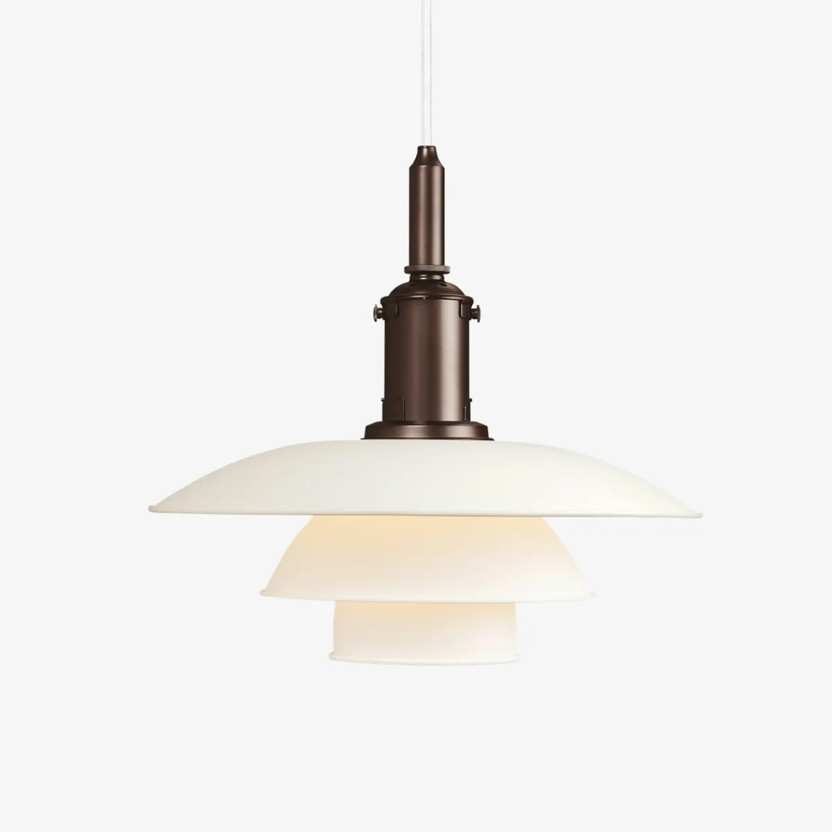 - Materiale: Skjermer: Munnblåst, hvitt opalt glass. Oppheng: metallisert messing, ekstrudert aluminium.