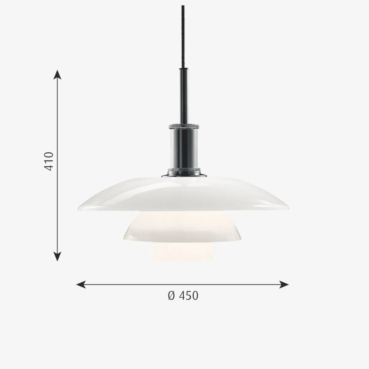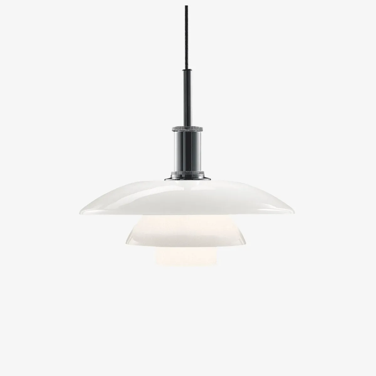- Materiale: Skjermer: Munnblåst, matt hvitt opalt glass. Blendfri skive. Oppheng: Høyglanset krombelagt, ekstrudert aluminium.