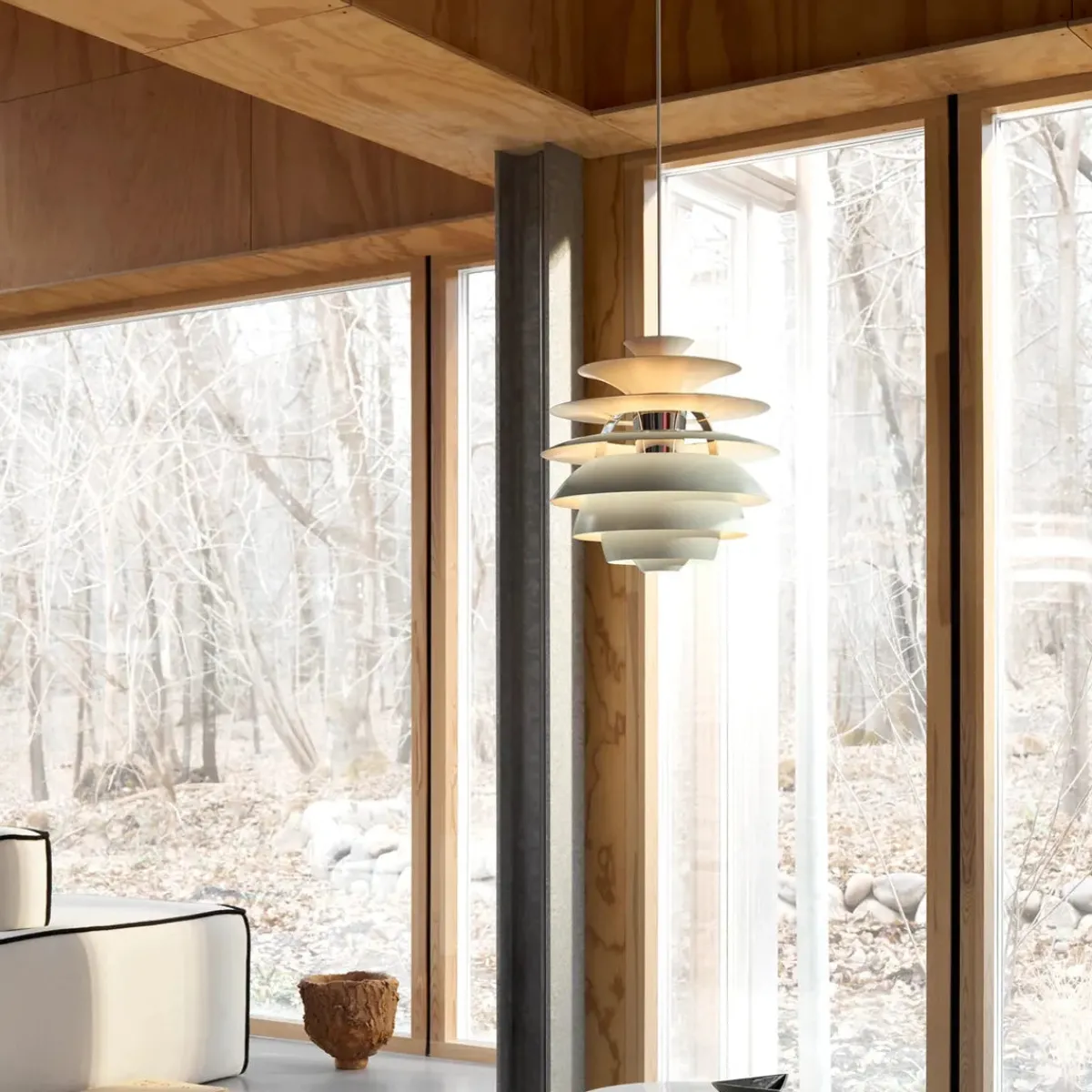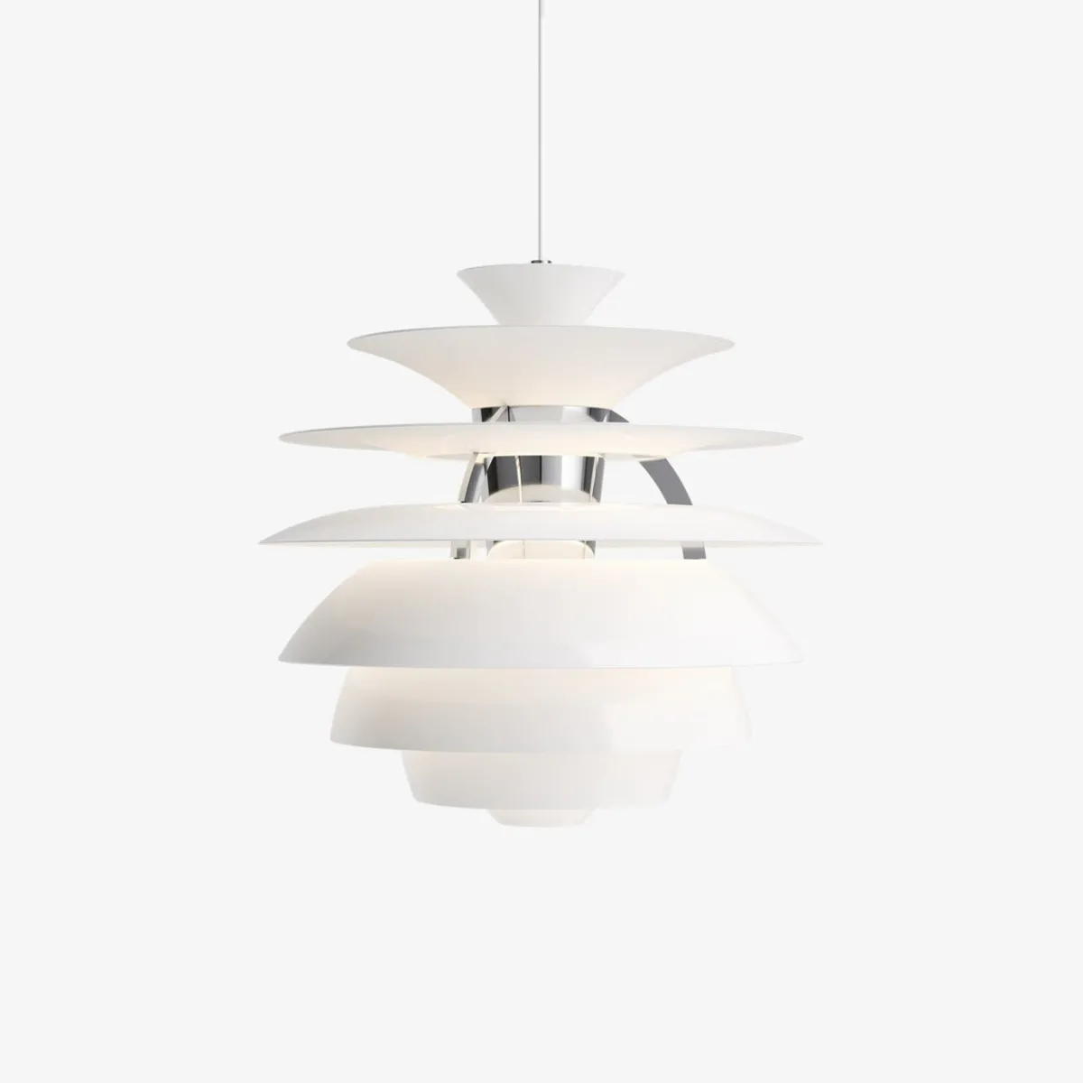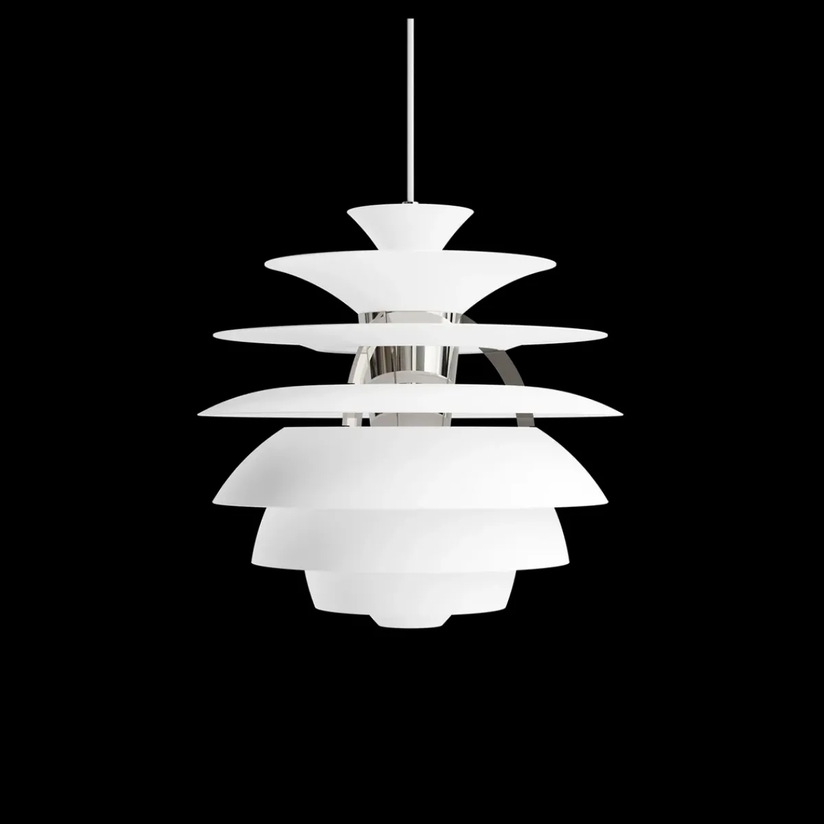 PH Snowball fra Louis Poulsen sender ut et komfortabelt og blendfritt dempet lys. Matte, malte undersider og blanke overflater gir en attraktiv refleksjon av det dempede lyset og skaper en jevn belysning rundt armaturen. Når lyset er slått på er den øverste delen opplyst mens den nederste delen forblir mørk.