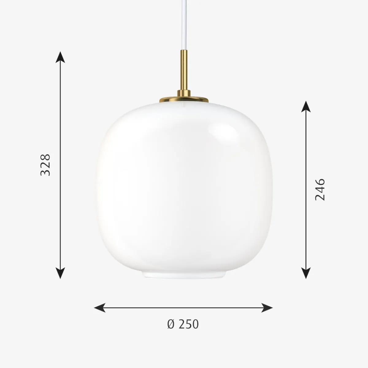 - Materiale: Skjerm: Munnblåst, polert, hvitt opalt glass. Pendelfeste: Ubehandlet børstet messing, vil patinere.
