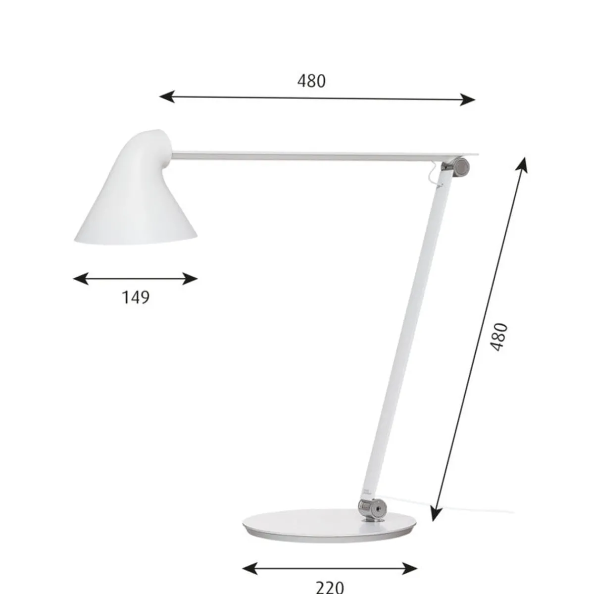 Louis Poulsen NJP bordlampe er en modernistisk vri på den klassiske arkitektlampen. Lampen gir direkte, blendfritt, horisontalt lys og reflekterer samtidig noe av lyset gjennom baksiden av hodet slik at øvre del av armen lyses opp. Det ergonomiske designet armaturhodet former lyset og sørger for optimal retning på lyset. Et enkelt mekanisk system gir stor bevegelsesfrihet, slik at lyset alltid kan stilles inn på det perfekte stedet på arbeidsplassen. Skjermen er malt hvit på innsiden og reflekterer behagelig, diffust lys.