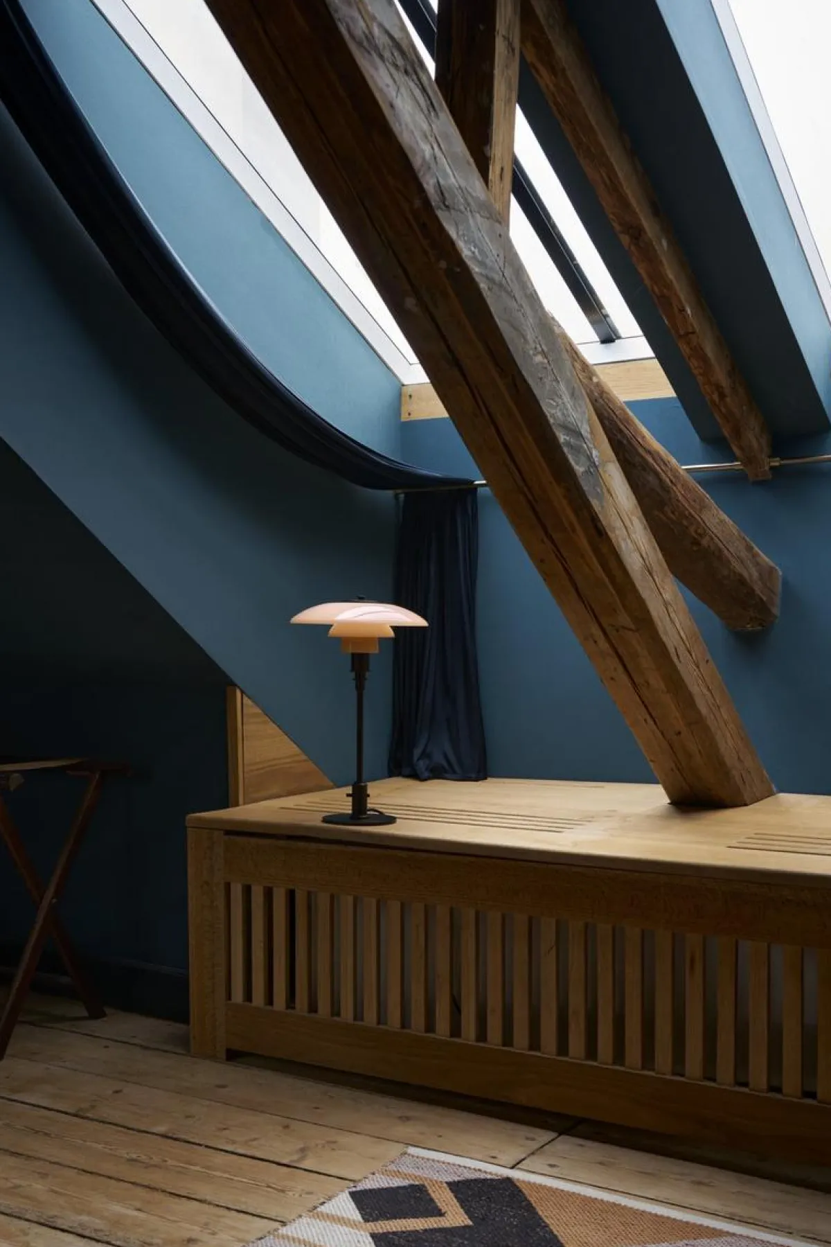 Henningsens trelags glasskjermer sprer lyset jevnt, reduserer blending og skaper en behagelig atmosfære – perfekt for å fremheve bord, kommoder eller vinduskarmer.