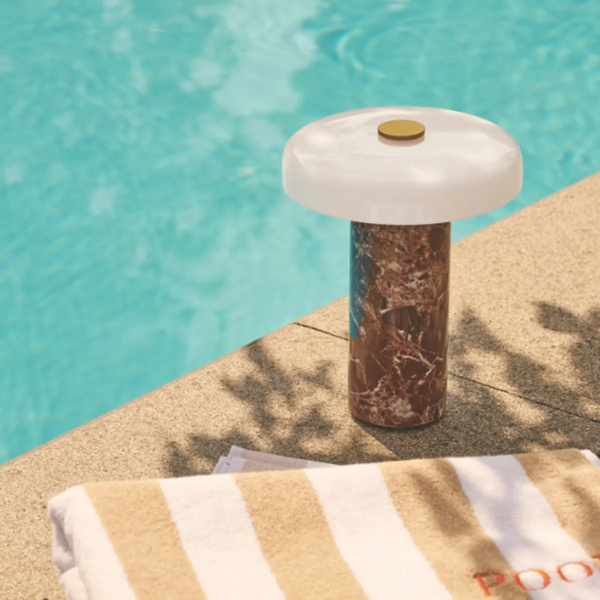 Lampen er like spenstig som den er vakker og kan brukes både innendørs og utendørs. Vi anbefaler imidlertid ikke at lampen skal stå ute i regnet eller om natten. Vær oppmerksom på at fargen og teksturen på lampefoten kan variere ettersom det er marmorstein.